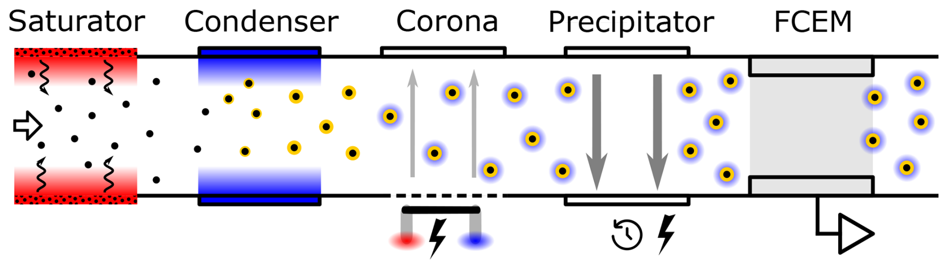 The sensor principle is open to a range of future improvements, including the potential adoption of an alternative WF and a refinement of the temperature settings. These modifications could further lower the particle detection limit to below 2 nm, enhance the instrument's linearity, and increase the upper concentration limit. Depending on the target application, the FCEM geometry and flow rate can be adapted. A reduction in FCEM size would result in faster gas exchange times and, consequently, an improved instrument response time. Conversely, a larger FCEM would increase sensitivity and reduce the limit of detection. Moreover, further investigation is required to assess the influence of the condensing vapor on the corona discharge process, as well as to evaluate the long-term stability of the sensor.