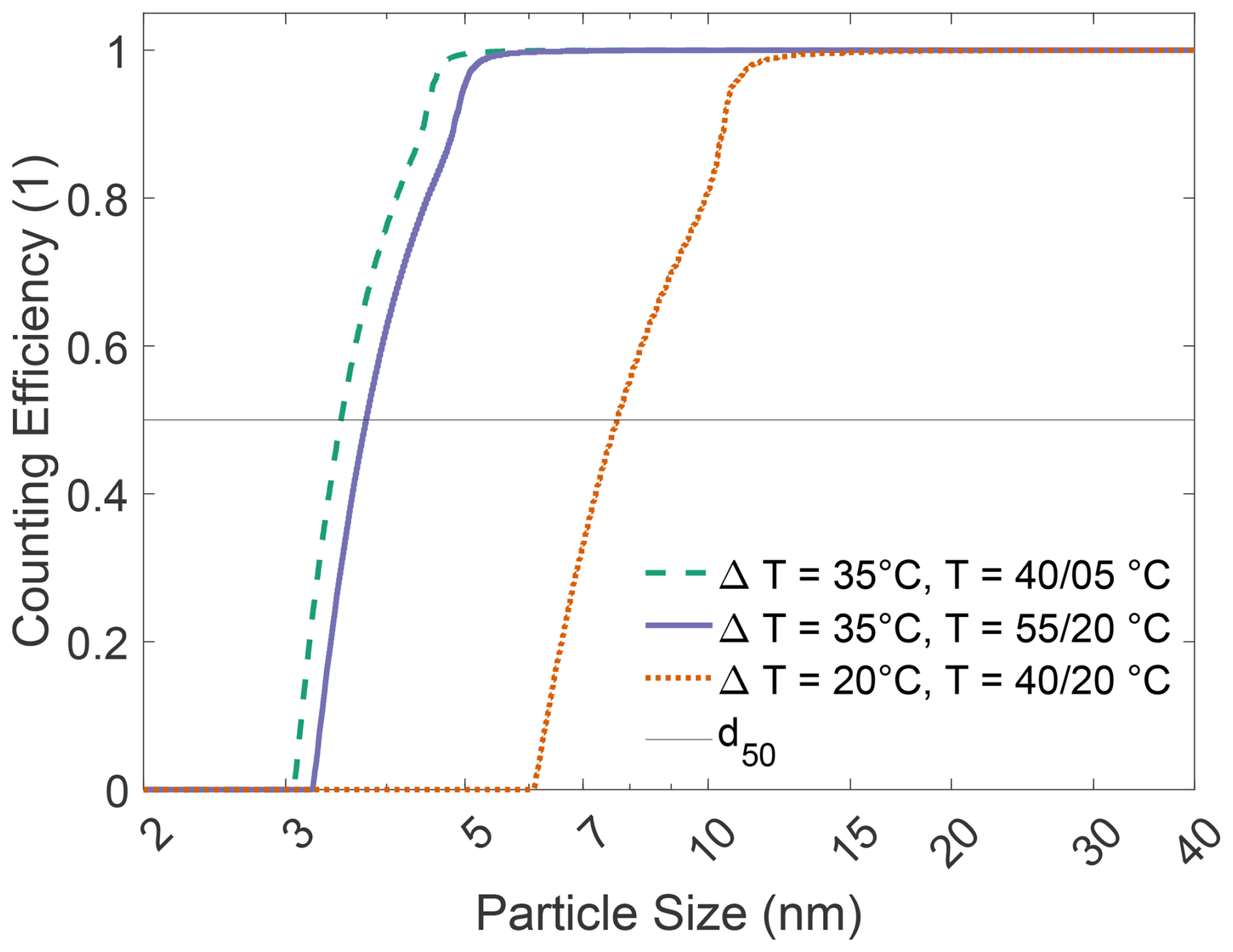 Increasing the ΔT further would allow the activation of particles down to 2 nm and below. However, due to the absence of a sheathed-flow design, diffusional losses in this size range become significant. Furthermore, the increased required supersaturation approaches that of homogenous nucleation, where clusters start to nucleate, leading to false counts in the detector.