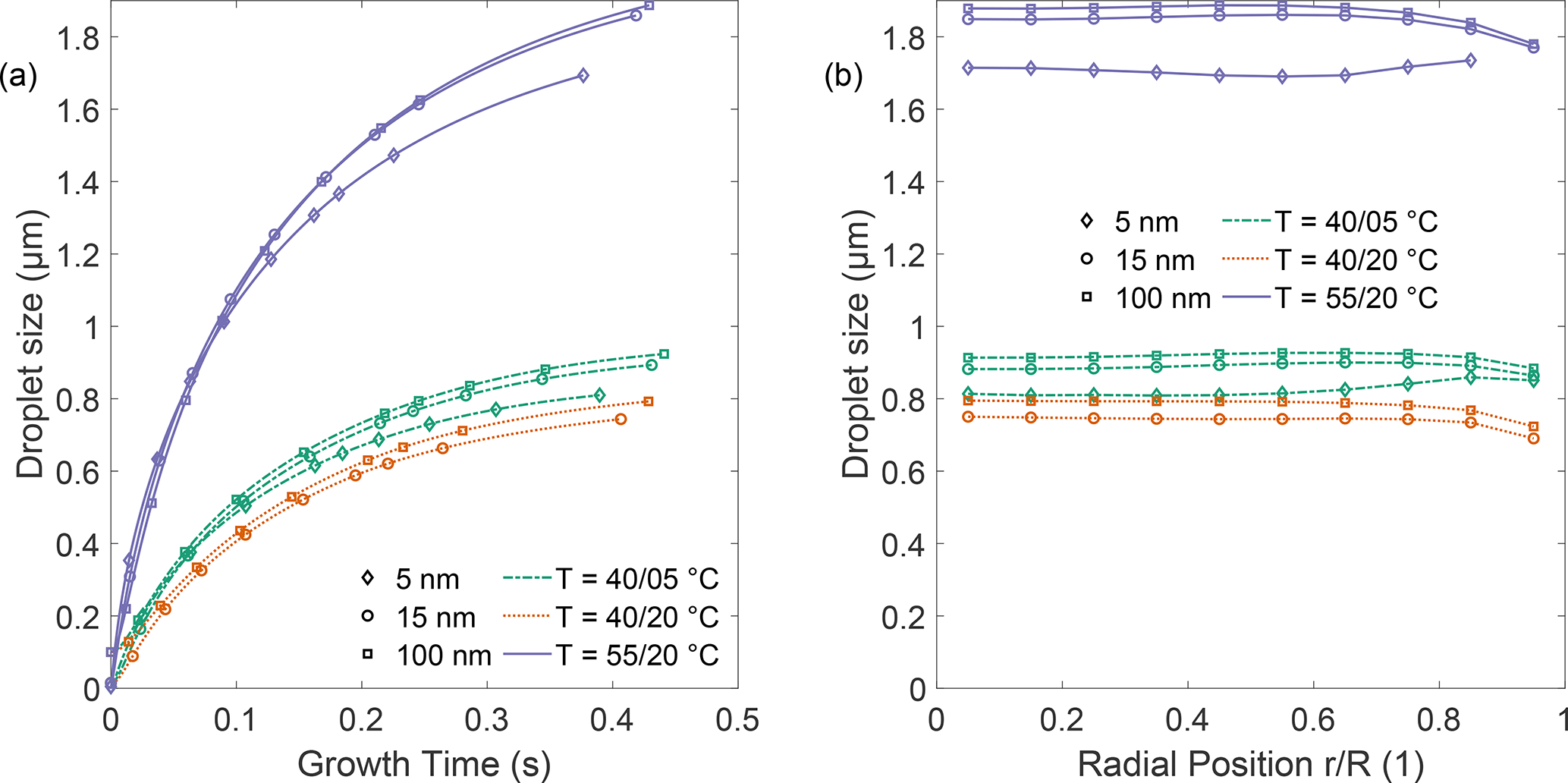 Figure 3(a) Simulated droplet growth along the radial position over time until the droplet reaches the charger. (b) Final droplet size dependency on the radial position and particle diameter. The color indicates the temperature setting used, and the marker and line type indicate the particle seed diameter.