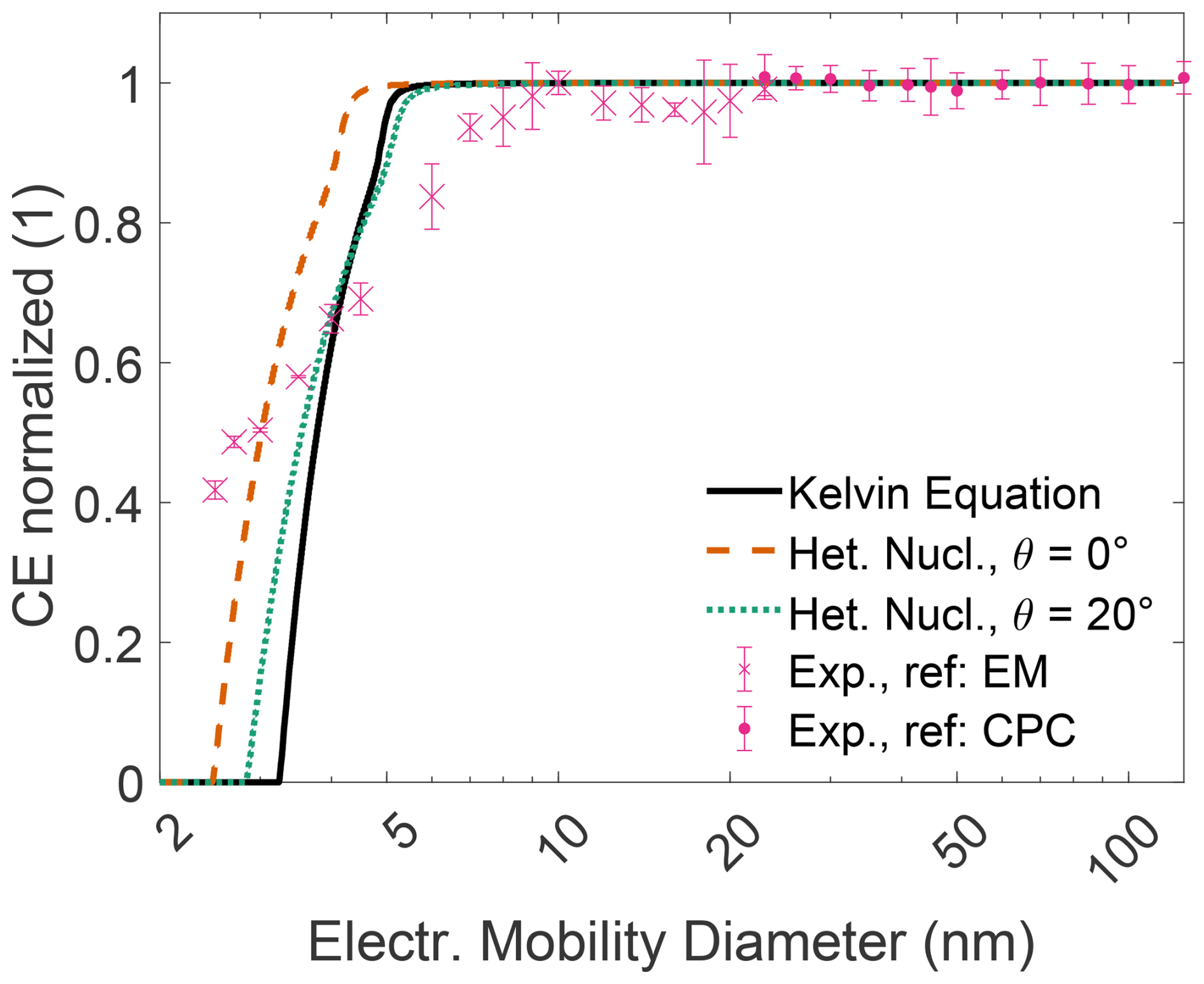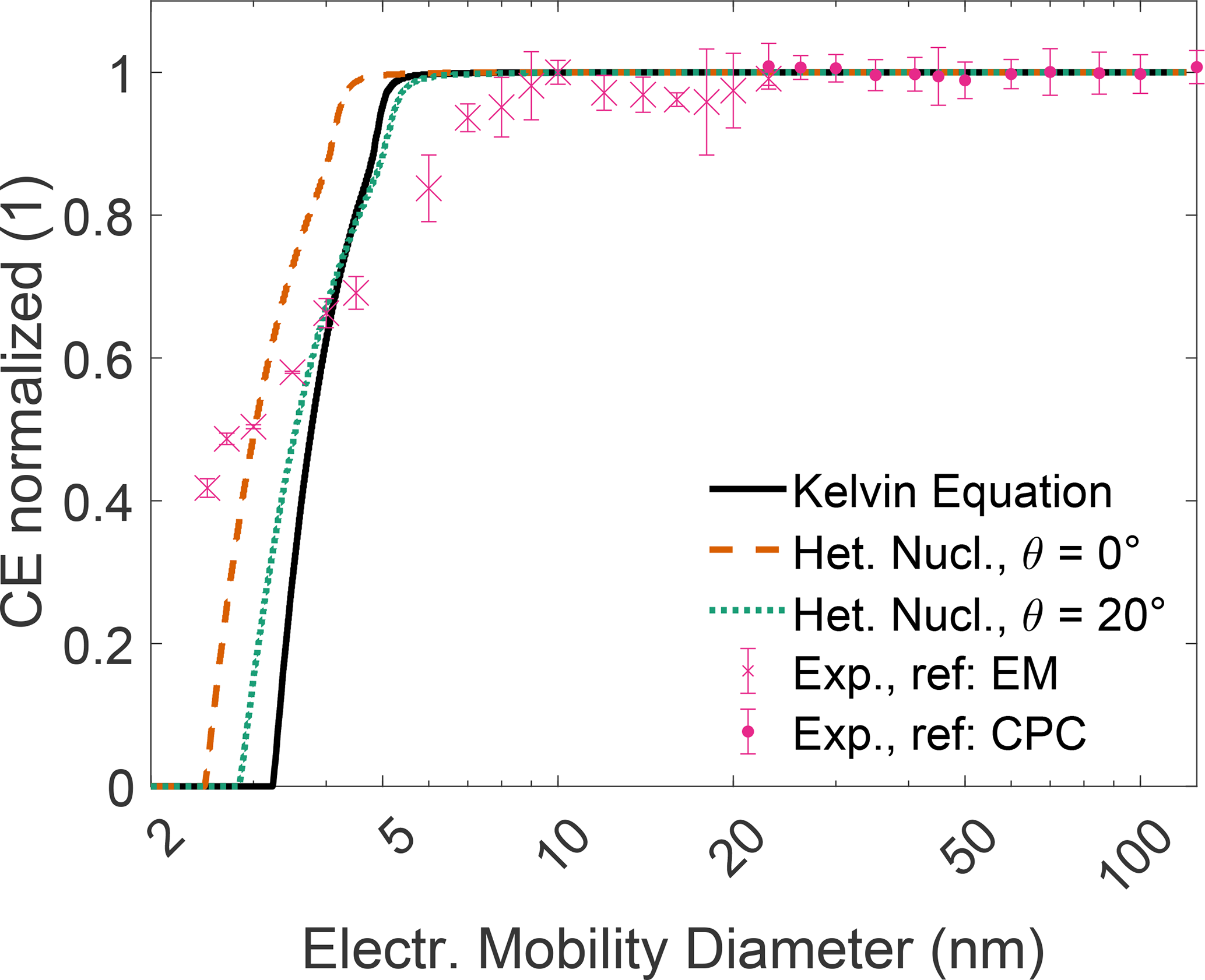As the simulation gives the ratio of activated particles, a reduction in final droplet size for particles close to the cutoff diameter due to later activation in the condenser is not considered. Therefore, the experimentally obtained CE in the transition regime is expected to be slightly lower than predicted by the simulation. For instance, a 20 % reduction in droplet size at 5 nm compared to larger seed particles is expected to decrease the signal by approximately the same amount, as per Eq. 2. Concentrations above the noise level of the reference EM could not be achieved below 2.4 nm with this setup. Below the d50 diameter, measured at 3 nm, both the Kelvin equation and heterogeneous nucleation theory underestimated the ratio of activated particles.