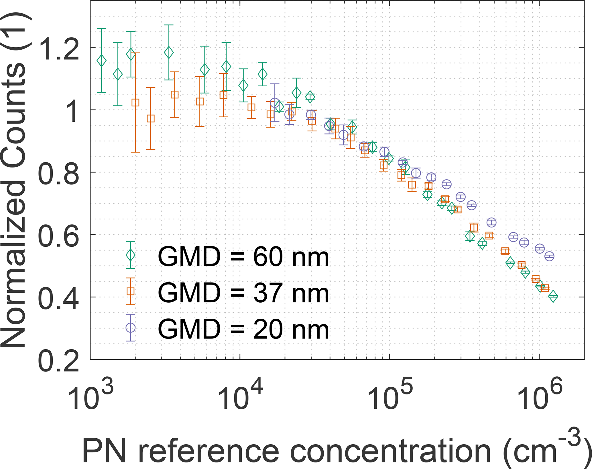 The observed reduction in raw counts at high concentrations is similar to the behavior of CPCs, which experience pulse overlap at high PN concentrations and apply internal coincidence correction to account for this reduction (Takegawa et al., 2017). For concentrations above the single-count mode range, some CPCs use a photometric mode and integrate the total scattered light intensity to measure the PN concentration. However, these measured concentrations strongly depend on the initial seed particle diameter and can vary by a factor of up to 3 for initial sizes between 10 and 100 nm at a concentration of 106 cm−3 (Giechaskiel et al., 2023).