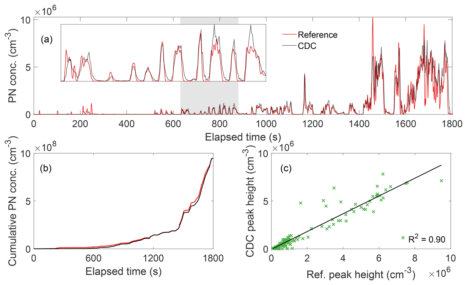 Figure 7Calibrated PN concentrations from a chassis dynamometer test. (a) Time-dependent measured concentration of both the CDC counter and a reference counter. (b) Background-adjusted cumulative PN concentration of both counters. (c) Correlation of 90 detected emission peaks.