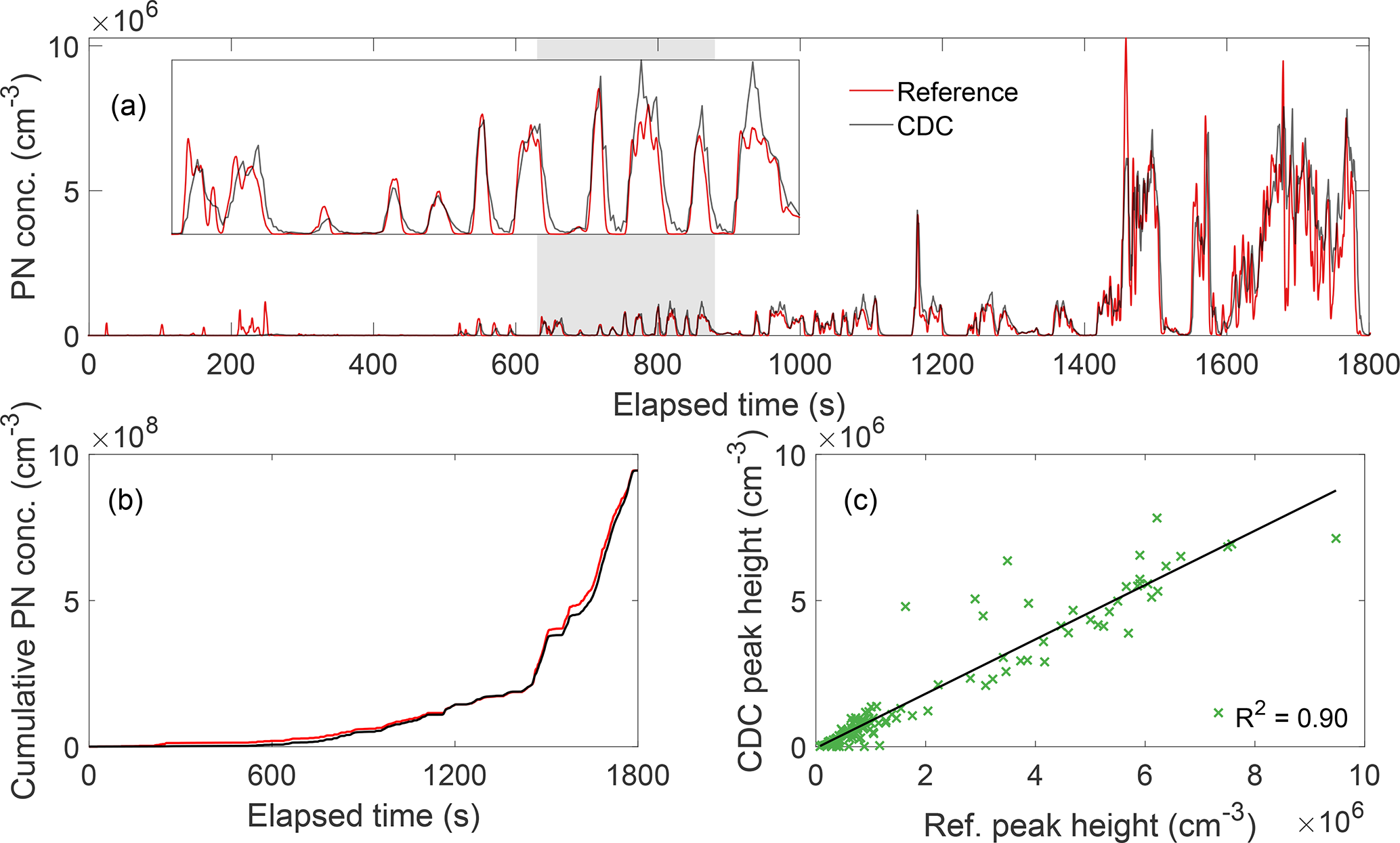 As shown in Fig. 7a, the CDC sensor closely followed the PN concentration of the reference CPC. This is also observed in the cumulative PN concentration (Fig. 7b), which shows good correlation between both instruments. At high PN concentrations toward the end of the driving cycle, the CDC system slightly over-counts compared to the reference counter after implementation of the concentration-dependent fit function. Peak detection was performed, and 90 emission peaks of the test cycle were identified. The maximum peak heights for both instruments were correlated to each other. The CDC shows a very good correlation with an R2 of 0.90. The slope of the correlation was k = 0.94 and therefore underestimated the peak height by about 6 % compared to the cumulative PN concentration. The slightly higher but narrower peak shape for the concentration measured with CPC indicates that the response time of the CDC is slightly below that of the reference counter after time averaging. An averaging of 3 s for the CPC resulted in a slope of k = 0.98, indicating that the real response time of the CDC is closer to 3 s.