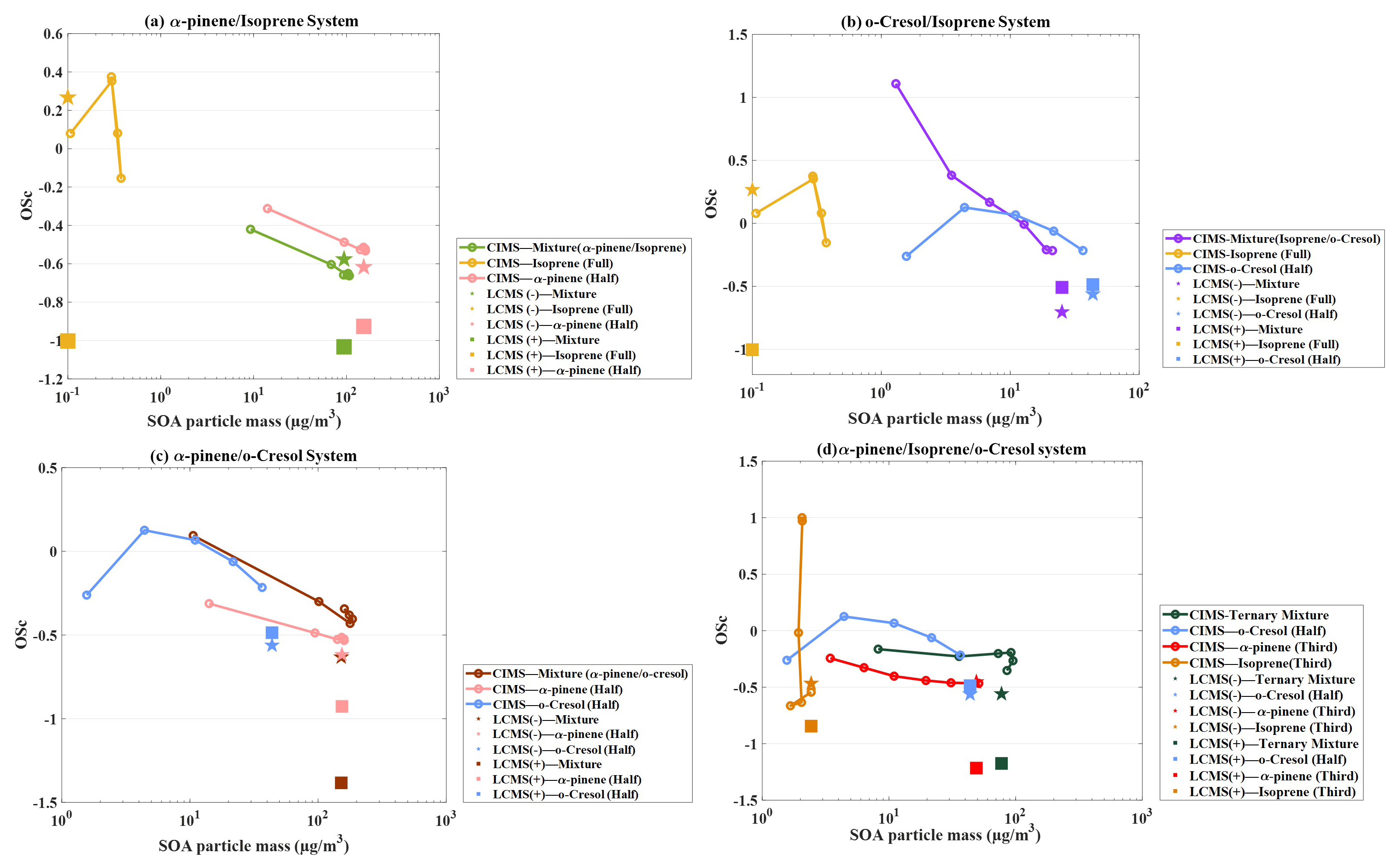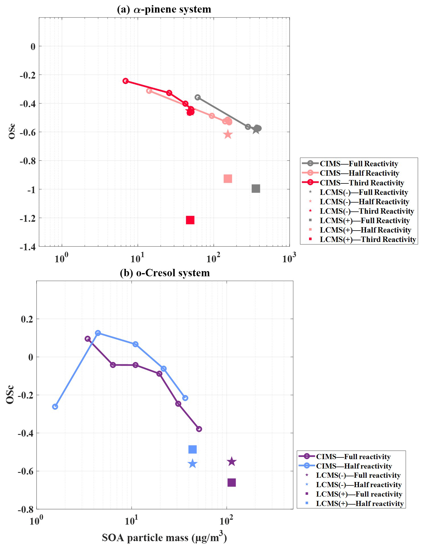 Figure 1 shows the average as a function of SOA mass concentration from single-α-pinene and single-o-cresol experiments with different initial reactivities derived from, respectively, FIGAERO-CIMS and UHPLC-HRMS measurements. All values shown here include the correction.
