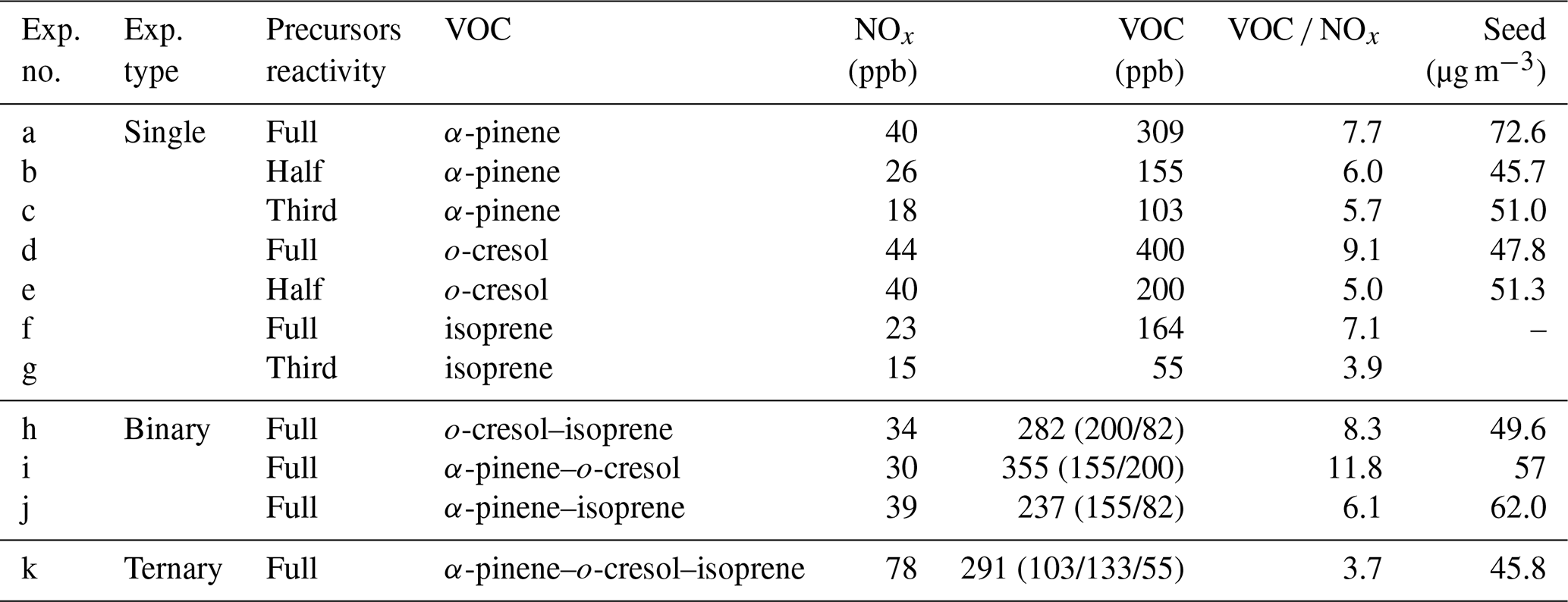 The concept of iso-reactivity in relation to OH radicals was used to select the initial VOC concentrations in each experiment to enable comparable initial turnover of VOCs in the mixture with respect to OH radicals, such that the oxidation products from each VOCs would make comparable contributions at the chosen concentration and under the experimental conditions at the beginning of the experiment. The injected mass of VOC precursors was calculated based solely on their reactivity with OH radicals (Atkinson et al., 2004), excluding their consumption by other oxidants (e.g. O3). A total of 13 experimental conditions were planned, covering the α-pinene, isoprene and o-cresol single-precursor experiments (each at full, one-half and one-third reactivity, respectively); binary α-pinene–isoprene, α-pinene–o-cresol and o-cresol–isoprene mixtures; and their ternary mixture. Initial concentrations of each VOC in the binary and ternary mixtures were the same as the initial concentration in the one-half- and one-third-reactivity individual VOC experiments, respectively, ensuring comparable initial reactivity in relation to OH in all systems.