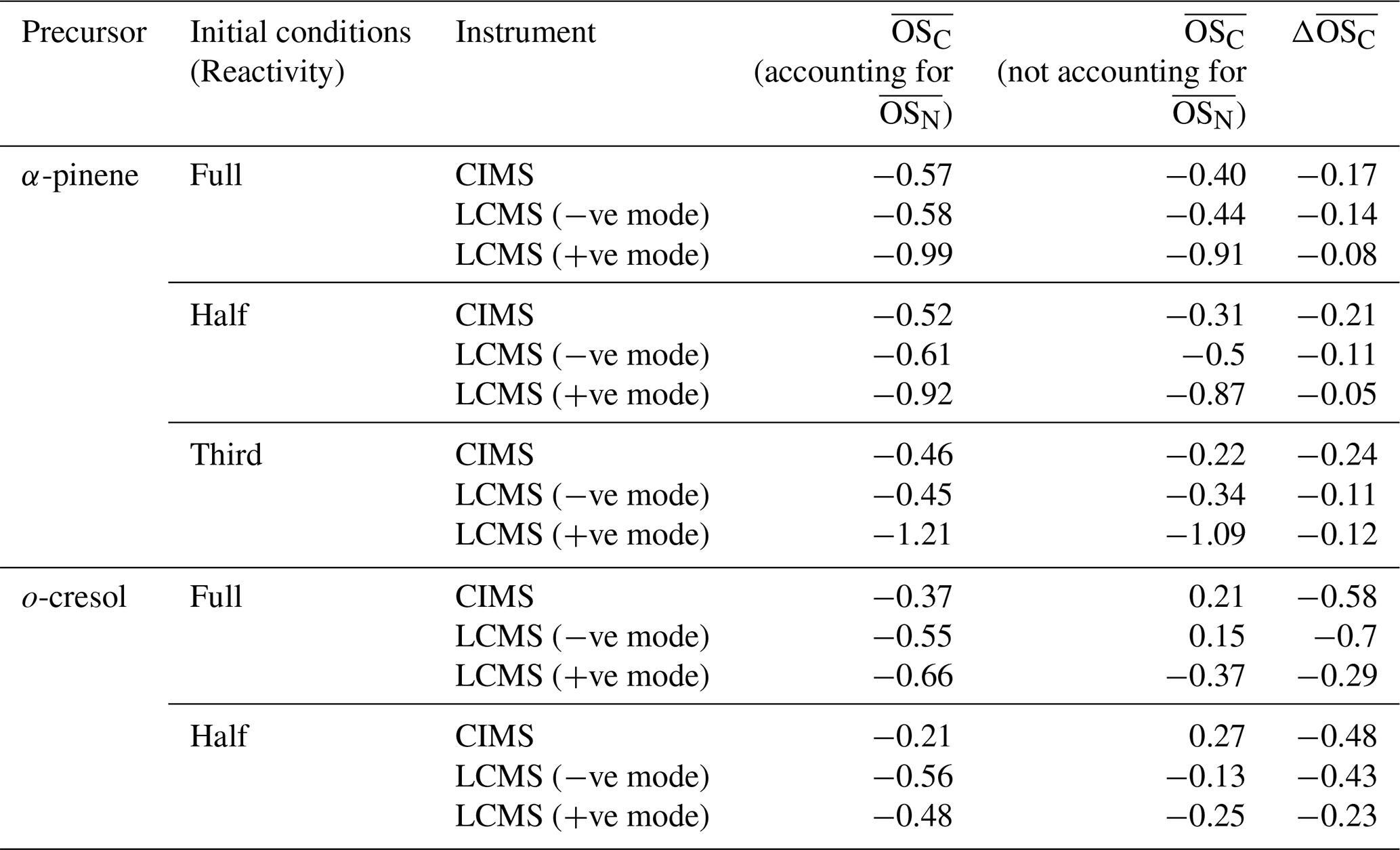 Table 2Average for single-α-pinene and single-o-cresol experiments across all reactivities, estimated from FIGAERO-CIMS (hereafter CIMS) and UHPLC-HRMS (hereafter, LCMS) measurements. For FIGAERO-CIMS, values correspond to the endpoint of each experiment, while UHPLC-HRMS values are based on filter extracts collected at the experiment endpoint. was estimated both accounting for and not accounting for the term of and the difference, (accounting for and not accounting for ).