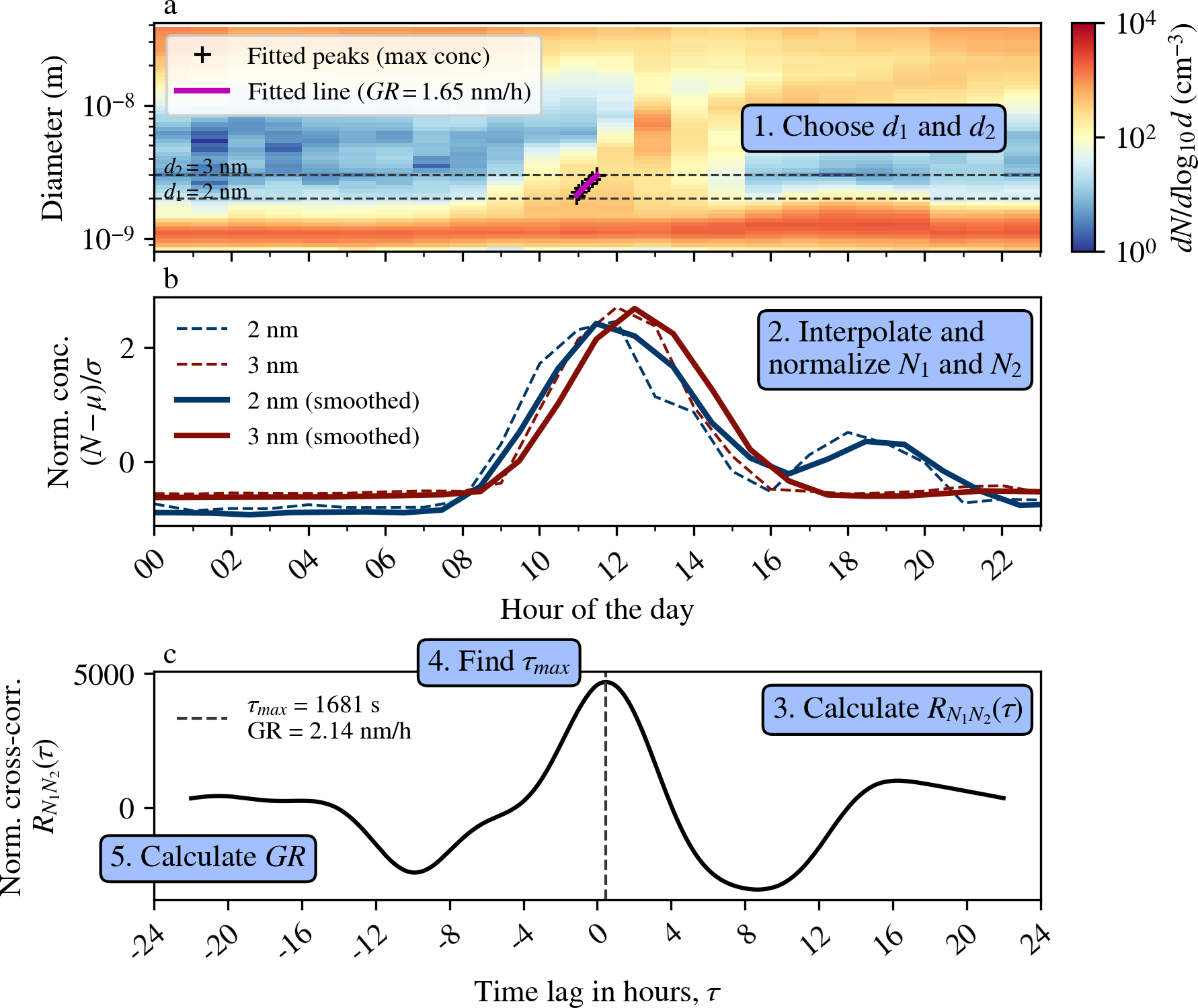 A similar approach to the representative time-based methods is to estimate the representative time lag between the rising concentrations in two separate size channels (Riccobono et al., 2012; Sihto et al., 2006). The GR is calculated by dividing the size difference with the time lag. The difference between finding representative time lags and representative times is subtle but relevant since in practice the methodology can be different and one may be more amenable to automation than the other. The representative time (lag)-based methods are suitable for instruments with a limited number of size channels and when the particle mode is not fully visible in the data, which is usually the case when the growing particles are sub-5 nm in size. Representative time (lag)-based methods do not require the absolute concentrations to be correct and can even work on raw signals.