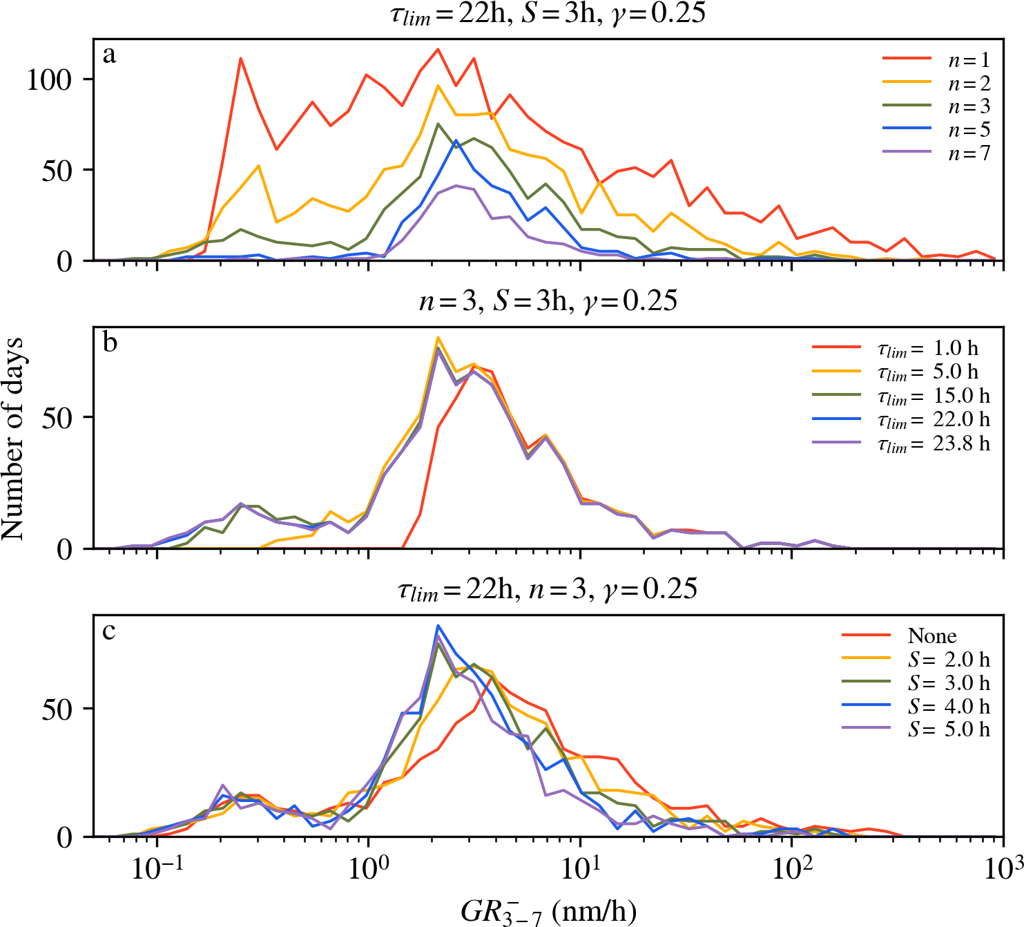 Figure 3c shows that increased smoothing window width shifts the GR distribution towards lower GR values. This is a known effect in the AT method as well (Lehtipalo et al., 2014). It may be that increased noise shifts the GR distribution towards higher GR values. In the analysis, we used S=3 h, which should be enough to remove some of the random concentration peaks and noise while preserving the gradual concentration increase due to NPF.