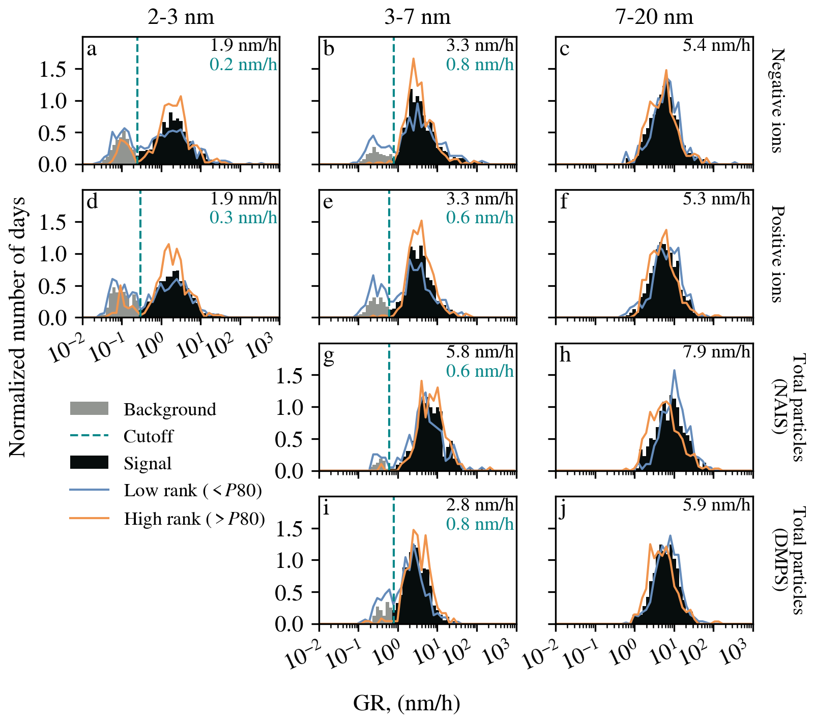 We also prepared Figs. S1–S4 (Supplement), which show examples of negative ion number-size distributions on days that are from the signal distribution and on days that are from the background distribution for 2–3 and 3–7 nm size ranges. The majority of the signal days, especially looking at the larger size range, show features typical of NPF event days, while the background days contain mostly days that would be classified as nonevent or undefined days (Dal Maso et al., 2005). This supports excluding them from the GR analysis.