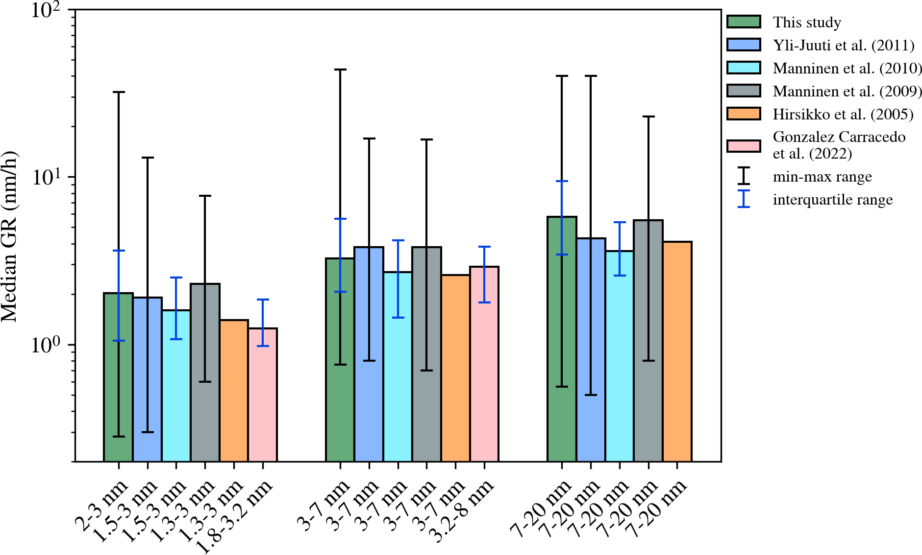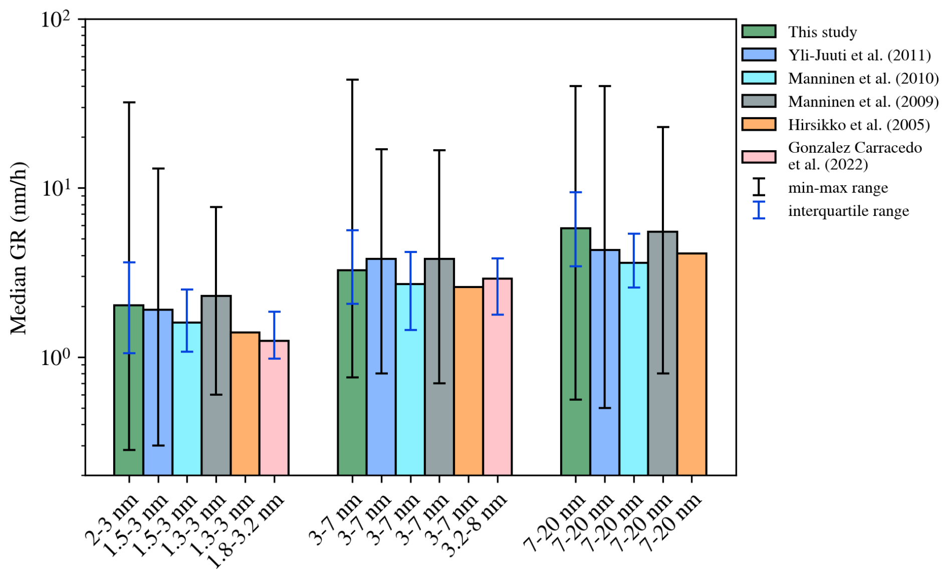 Figure 10Comparison of GRs obtained in this study against published data from Hyytiälä. The bar height is the median GR in each size range, and the error bars show different ranges of GR values reported in the studies.