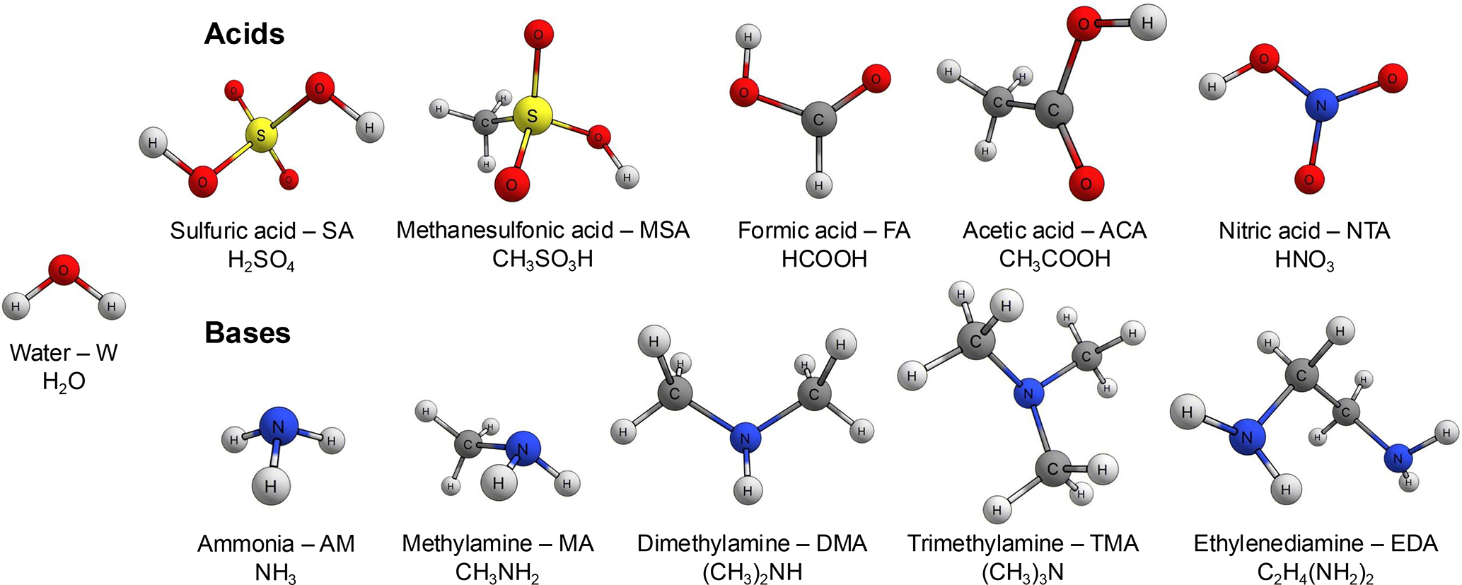 While the full range of atmospheric molecules contributing to NPF is still unknown, research has shown that clusters containing various acids and bases can rapidly form under atmospheric conditions. Acid–base clusters are stabilized by proton transfer between the acid and base components, forming strongly bound salt. Sulfuric acid (H2SO4; SA; Sipilä et al., 2010) plays a well-established role in NPF, while other acids, such as methanesulfonic acid (CH3SO3H; MSA; Dawson et al., 2012) and nitric acid (HNO3; NTA; Wang et al., 2020) have been proposed as potential contributors. Formic acid (HCOOH; FA) and acetic acid (CH3COOH; ACA), the most common organic acids in the atmosphere (Andreae et al., 1988; Keene et al., 1983; Keene and Galloway, 1984; Galloway et al., 1982; Millet et al., 2015), have been shown in computational studies to enhance NPF (Zhang et al., 2022). The most widely studied bases in atmospheric acid–base clusters are amines, with dimethylamine ((CH3)2NH; DMA) and trimethylamine ((CH3)3N; TMA) playing a significant role, while ammonia (NH3; AM), methylamine (CH3NH2; MA), and ethylenediamine (C2H4(NH2)2; EDA) have lower contributions (Almeida et al., 2013; Kurtén et al., 2008; Jen et al., 2016; Myllys et al., 2019; DePalma et al., 2012, 2014; Kirkby et al., 2011).