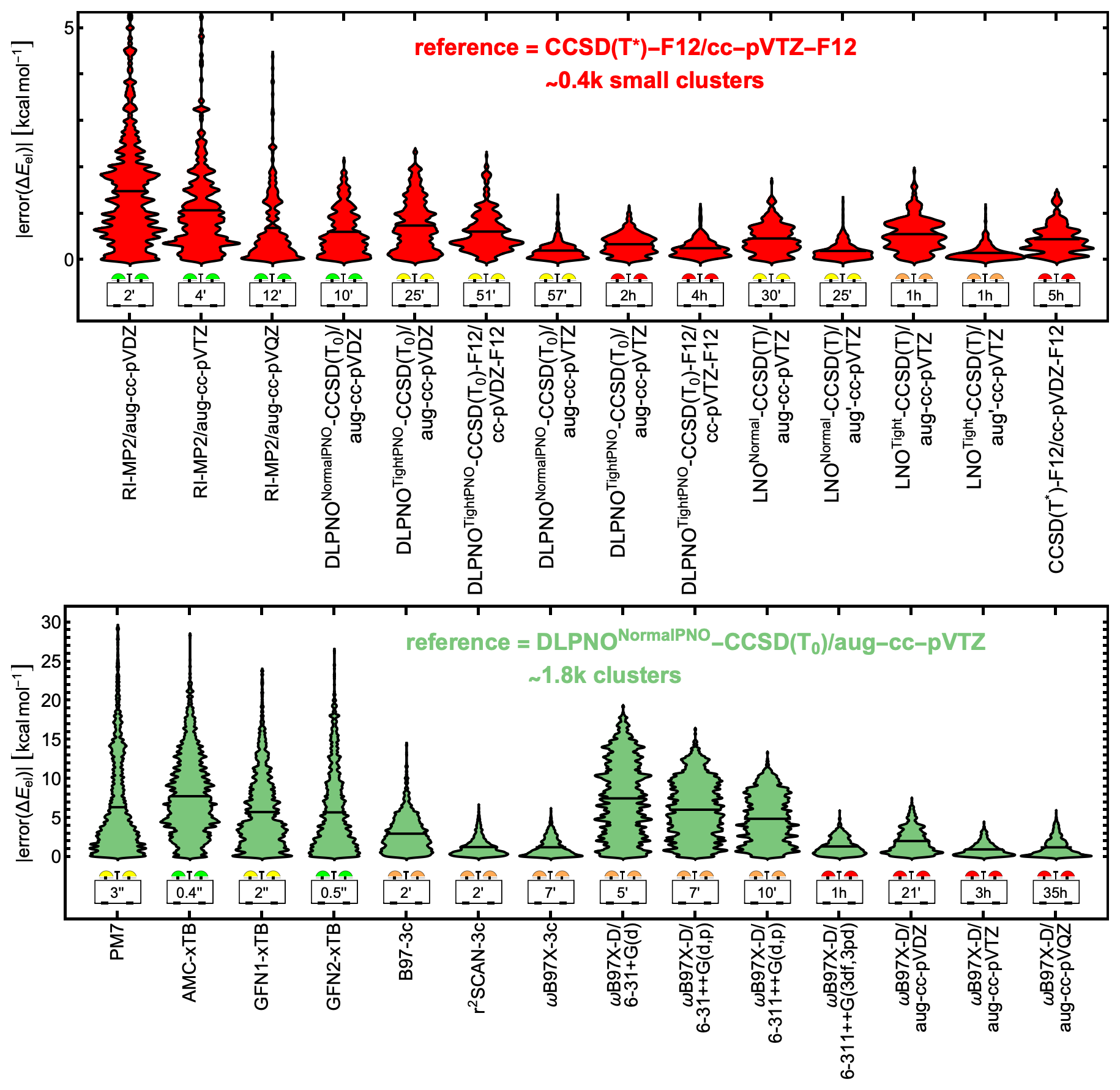 Figure 2Violin plots of absolute errors in electronic binding energies for microhydrated monomers and dimers. Height indicates error magnitude, width represents the number of configurations with the same error, and vertical black lines mark mean absolute errors. The dataset includes all 395 unique combinations of the molecules in Fig. 1, with the formula (acid and/or base)0–2(water)0–5. Top: RI-MP2, DLPNO, and LNO methods, benchmarked against CCSD(T*)-F12/cc-pVTZ-F12 for a subset of ∼ 400 small clusters. Bottom: semi-empirical, DFT-3c, and ωB97X-D methods compared to DLPNONormalPNO-CCSD(T0)/aug-cc-pVTZ for the full dataset of ∼ 1800 clusters. Average CPU times are given in seconds (′′), minutes (′), or hours (h).