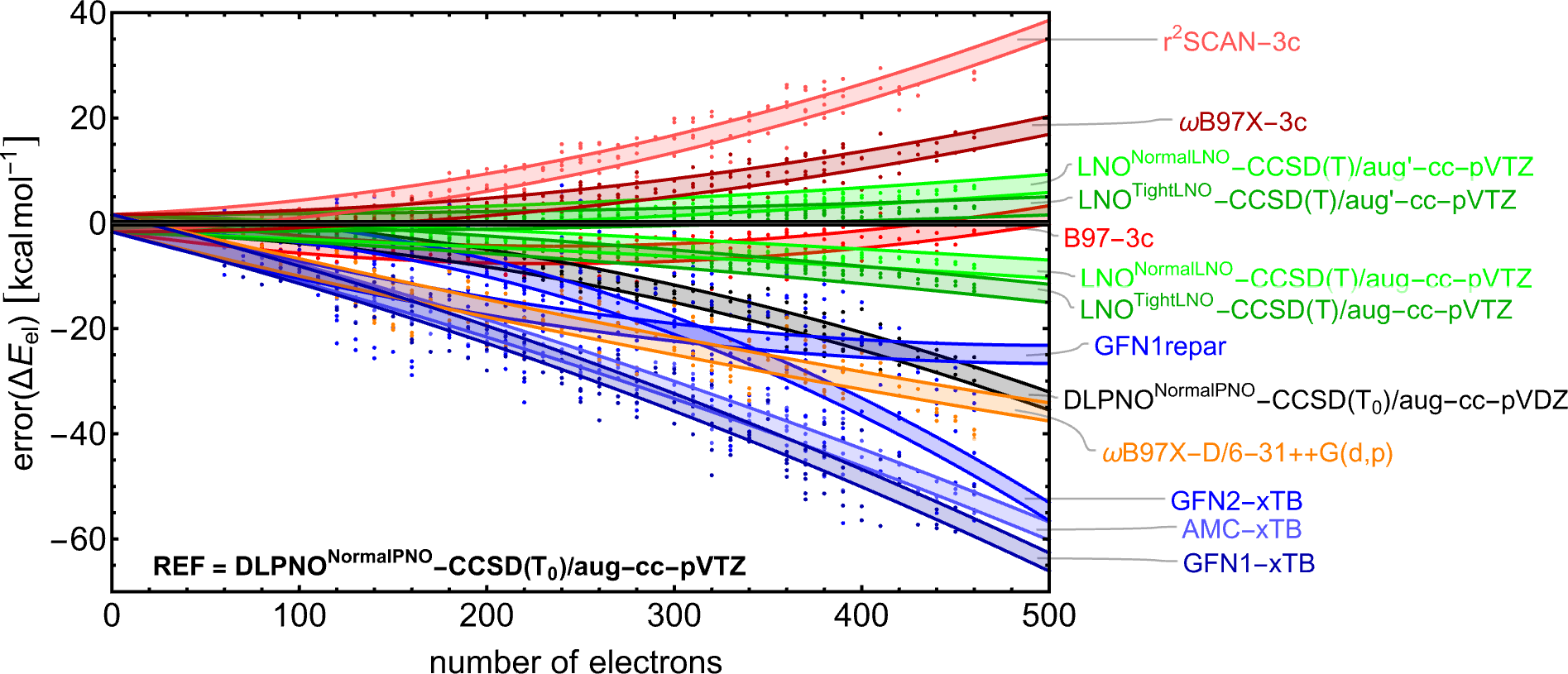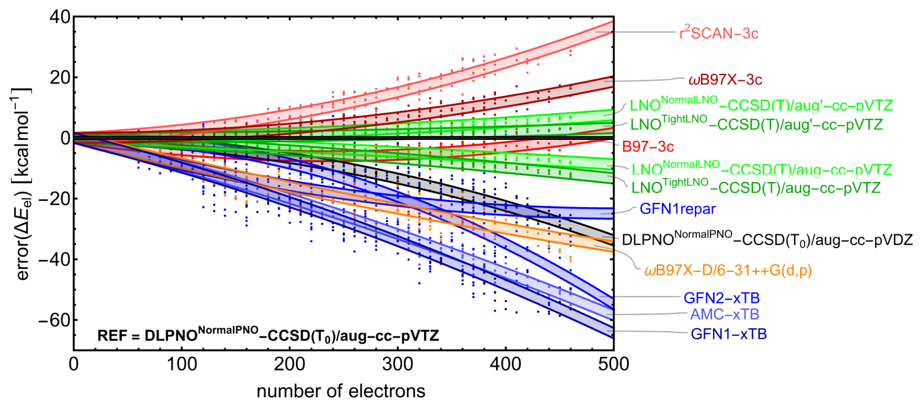Figure 3The signed error in (electronic) binding energy (kcal mol−1) relative to the DLPNONormalPNO-CCSD(T0)/aug-cc-pVTZ reference calculations as a function of the number of electrons for multiple quantum chemistry methods. Electronic energies were determined from single-point energy calculations for three conformers across all clusters with the composition (SA1AM1)1–6W0–10, randomly selected from the GFN1-xTB-optimized geometries. A second-order polynomial, constrained to pass through the origin [0,0], was fit to the data for each quantum chemistry method. The shaded area illustrates the 90 % confidence intervals for individual predictions based on this fit.