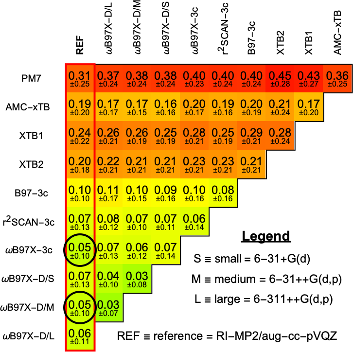 The r2SCAN-3c and ωB97X-3c methods perform particularly well, with MAEs of 1.29 and 1.26 kcal mol−1 but still with maximum absolute errors of ∼ 6.5 and ∼ 6.1 kcal mol−1, respectively. However, ωB97X-3c requires more than 3 times the CPU time of the other two DFT-3c methods studied.