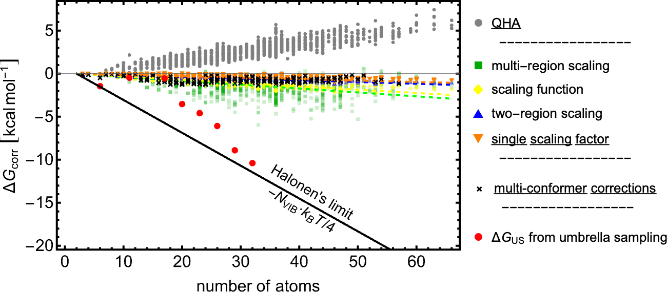 Figure 5 shows the free-energy contributions from these corrections as a function of the number of atoms in the cluster. Halonen (2024) used MD simulations with force-field methods to demonstrate that the combined effects of anharmonicity and interconversion between minima can reach up to per vibrational mode. We refer to this upper bound as the Halonen thermodynamic limit (black line).