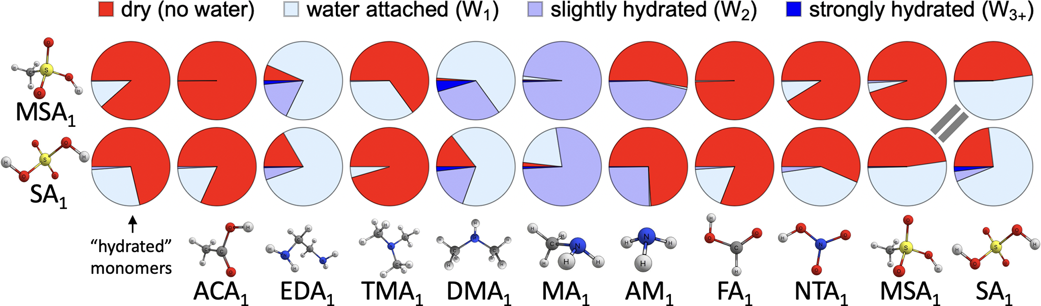 Figure 6Pie charts of the hydration distribution at 100 % relative humidity and 278.15 K for all studied monomers and dimers with up to five water molecules. No hydration is indicated in red, while clusters with one to five water molecules are represented with increasingly darker shades of blue. The results were obtained for the lowest free-energy minimum at the DLPNO//DFT level of theory using quasi-harmonic approximation.