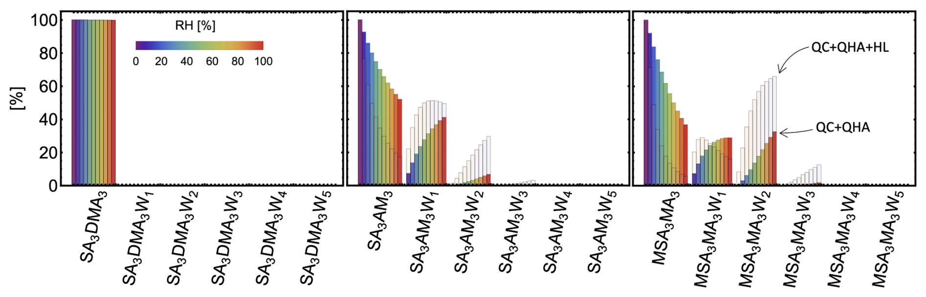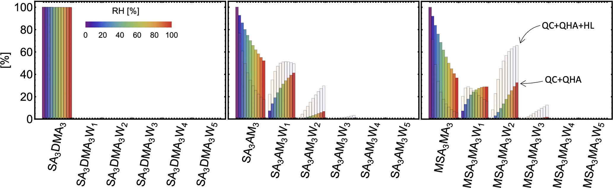 Figure 7Hydration distributions of the SA3AM3, SA3DMA3, and MSA3MA3 clusters at 278.15 K. The humidity level is indicated by different colors. The results were obtained for the lowest free-energy minimum at the DLPNO//DFT level of theory using quasi-harmonic approximation. The transparent distribution shows the change due to the free-energy correction at the Halonen limit.