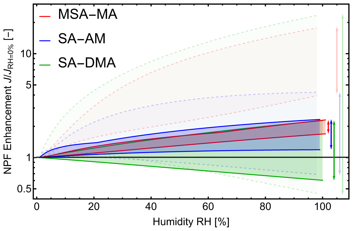 Hydrated sulfuric acid–ammonia (SA0–3AM0–3W0–5), sulfuric acid–dimethylamine (SA0–3DMA0–3W0–5), and methanesulfonic acid–methylamine (MSA0–3MA0–3W0–5) clusters were studied using cluster population dynamics to investigate the effect of humidity on the NPF rate.