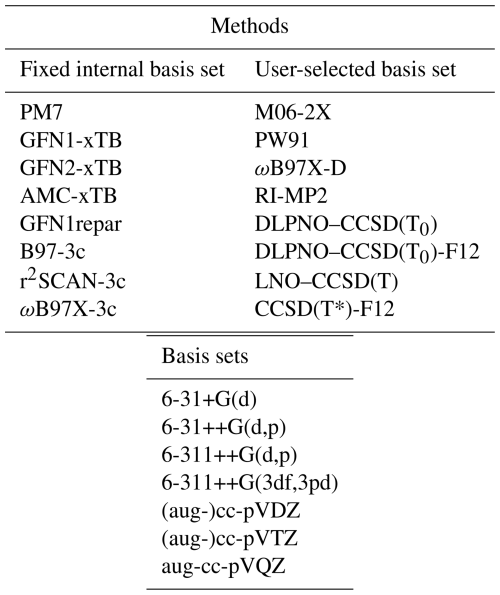 We benchmarked a range of QC methods – from semi-empirical to high-accuracy wavefunction-based approaches – for their accuracy in predicting electronic binding energies and equilibrium geometries of atmospherically relevant hydrated clusters (Table 1). PM7 (Stewart, 2012) is a semi-empirical method based on the Hartree–Fock (HF) formalism. GFN1-xTB (Grimme et al., 2017) and GFN2-xTB (Bannwarth et al., 2019), developed by the Grimme group, are density-functional tight-binding methods. AMC-xTB (Knattrup et al., 2024) and GFN1repar (Wu et al., 2024) are reparameterizations of GFN1-xTB tailored for calculations of atmospheric molecular cluster equilibrium structures and electronic binding energies.