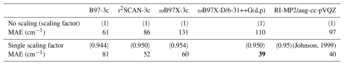 Scaling factors have been defined for various methods (Johnson, 1999; Myllys et al., 2016; Tikhonov et al., 2024). However, we fitted our own scaling corrections for the (acid and/or base)0–2W0–5 clusters, testing four approaches: (1) a single constant scaling factor across the full frequency range, (2) two separate constant scaling factors for the regions below and above 2000 cm−1, (3) multi-region constant scaling factors with a region size of 100 cm−1, and (4) a flexible scaling function of the form . The details of the fitting and analysis are provided in Sect. S6. Here, we only summarize that we find that a single scaling factor is sufficient, with no significant improvement from more complex corrections. Table 2 shows the MAEs relative to experimental (Dunn et al., 2006; Huber and Herzberg, 1979; Shimanouchi, 1972; Otto et al., 2014; Rognoni et al., 2021; Vogt and Kjaergaard, 2022; Hintze et al., 2003; Rozenberg et al., 2012; Kjaersgaard et al., 2020; Soulard and Tremblay, 2021; Fateley and Miller, 1962; Li et al., 2016; Fernández et al., 2005; Herzberg, 1966; Koops et al., 1983; Zhang et al., 2021; Telfah et al., 2024; Lewandowski et al., 2005; Maroń et al., 2009; McCurdy et al., 2002) vibrational frequencies with and without applying a single scaling factor. Ideally, scaling factors would be fitted directly to experimental fundamentals, but the lack of consistent, unambiguous vibrational assignments for many of the studied clusters makes this infeasible; we therefore adopt the internally consistent and fully automatable harmonic–VPT2 approach.