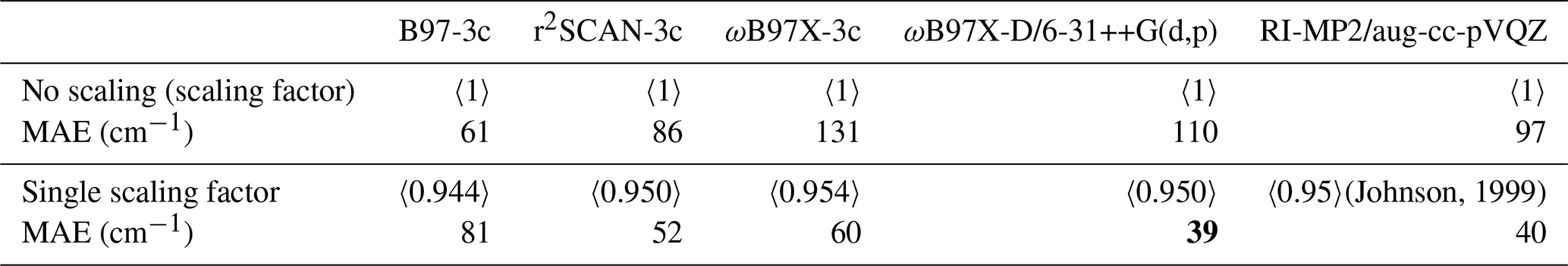 (Johnson, 1999)Table 2The single scaling factor obtained by fitting to the difference between the anharmonic (VPT2) and harmonic vibrational frequencies compared to the list of experimental observations. See details in Sect. S6. The bold value indicates the lowest deviation from experiments.