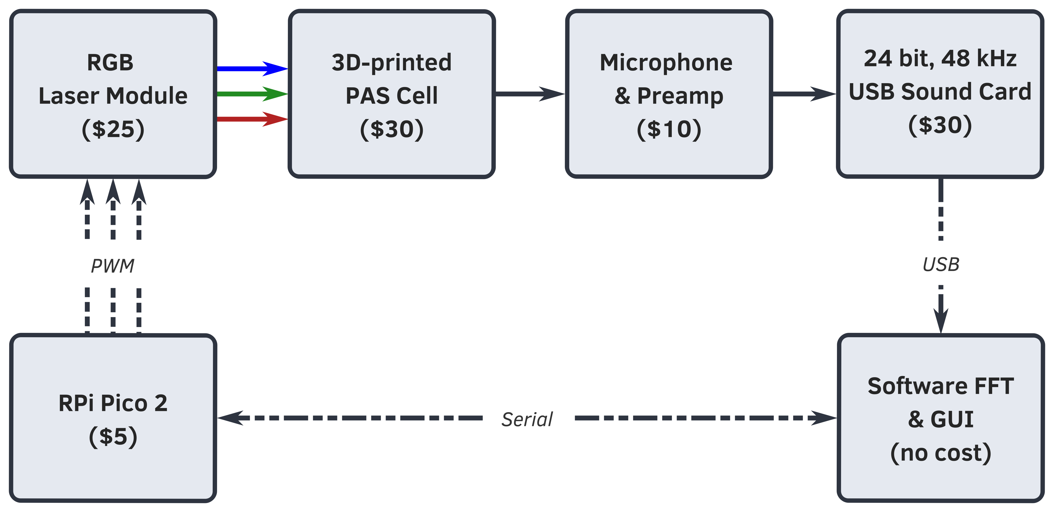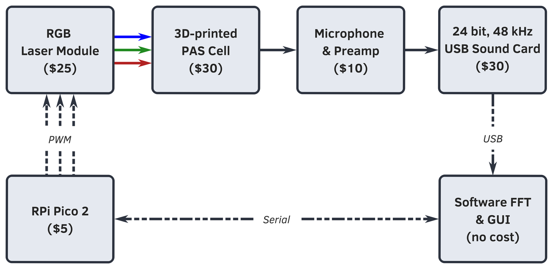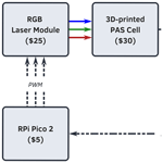 Figure 1Functional block diagram of the SiMPLE-PAS, including rough cost estimates for each item. A Raspberry Pi Pico 2 development board is used to control an RGB laser module that illuminates the 3D-printed PAS cell at three distinct frequencies (one for each wavelength); the signal is digitized with a USB sound card, and an FFT is performed on the signal using custom software written in Julia, which also allows for user control of the lasers and other PAS components. A full cost breakdown is provided in the Supplement.