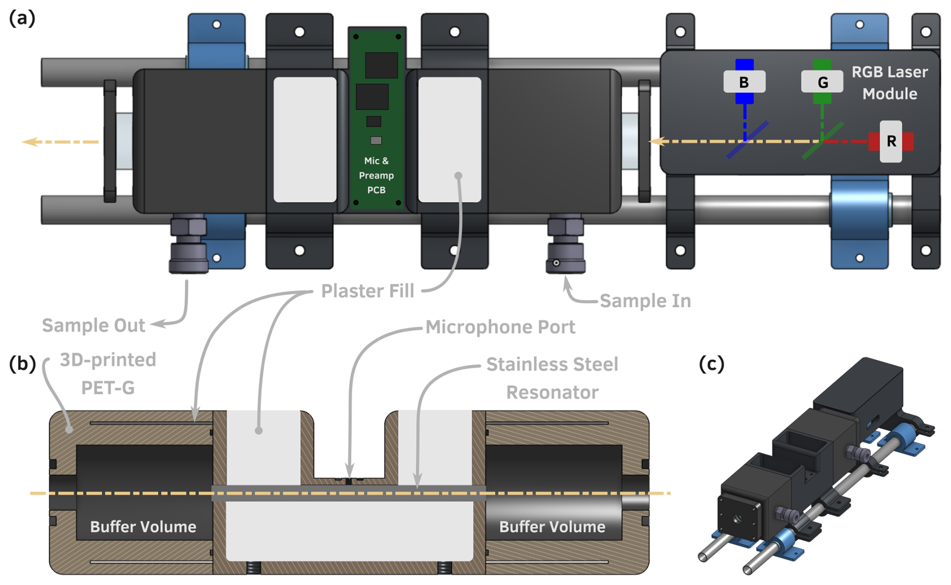 Figure 2Hardware components of the SiMPLE-PAS. (a) Top view of the SiMPLE-PAS. (b) Cross-section (side view) of the PAS cell showing the internal cell geometry, including plastic shell, infill areas that are filled with calcium sulfate, and the stainless steel resonator tube. (c) Isometric view of the SiMPLE-PAS (infill regions shown as empty). All components are mounted on a carbon fiber rail system that screws into a rugged case via acoustic isolation mounts. Photos of the laser module, PAS, and filling process are given in the Supplement.