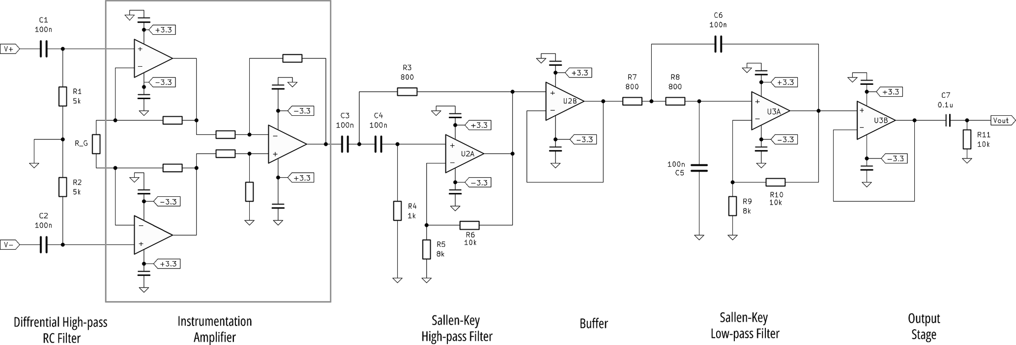 Figure 3Equivalent schematic for the SiMPLE-PAS preamplifier. The differential output from the microphone is represented by V+ and V− in the schematic. The instrumentation amplifier is implemented using a dedicated instrumentation amplifier IC, with only RG being supplied externally to the IC. U2 and U3 are dual op-amp ICs, such that the four op-amps for the filters and buffers require two ICs. The simulated output for the circuit is provided in the Supplement.