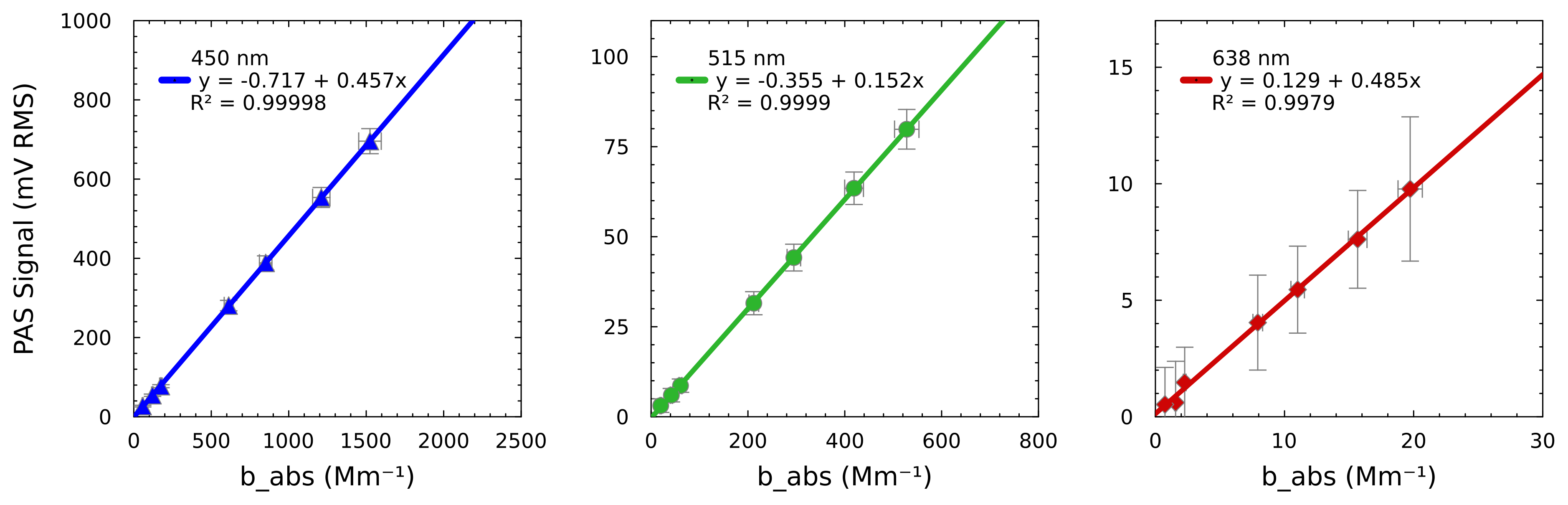 Figure 4Calibration of the SiMPLE-PAS. Points represent 2 min average measurements of NO2, and errors bars for y show 1 standard deviation of the PAS signal and the background propagated with the uncertainty of the ratios of the NO2 absorption cross-sections at each wavelength (λPAS/446 nm), and error bars for x are 1 standard deviation of the CRDS signal propagated with the uncertainty of flow rates and RL for 2 min averages (x). The points from 0 to 2 Mm−1 for the red channel highlight the 2 min limit of detection for the SiMPLE-PAS, which is 1.0 Mm−1 for the red channel. A zoomed-in version of the plots showing low absorbance values is provided in the Fig. S8.