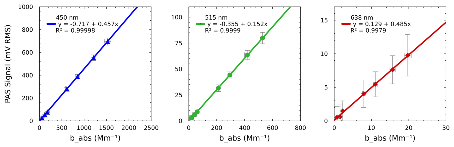 In the atmosphere, absorbing aerosols are typically composed of black carbon (BC), brown carbon (BrC), or a mixture thereof, with an absorption spectrum following the form of , where babs is the absorption coefficient of the aerosol, λ is the wavelength, and β is the pre-exponential scaling factor (Moosmüller et al., 2009). These categories are largely defined by their spectroscopic characteristics (not chemical composition), with black carbon having an AAE of 1.0 and brown carbon having an AAE of ≫ 1.0 (Moosmüller et al., 2011; Saleh et al., 2018). Instruments with at least two wavelengths can retrieve the aerosol AAE using a linear fit to log-transformed data, although it is typically better to have at least three or four wavelengths for separating the individual contributions of BC and BrC to the overall absorption spectrum (Zhang et al., 2016; Nakayama et al., 2015). Fischer and Smith (2018a) developed a four-wavelength, multi-pass PAS called the MultiPAS-IV, and another group uses a three-wavelength derivative of this instrument called the MultiPAS-III (e.g., Yu et al., 2021; Cheng et al., 2021). More recently, Schnaiter et al. (2023) developed the PAAS-4λ, which used a single-pass PAS cell but yielded similar detection limits to multi-pass instruments. And, even more recently, a three-wavelength cantilever-enhanced PAS (i.e., QE-PAS) was developed for aerosol absorption (Karhu et al., 2025).