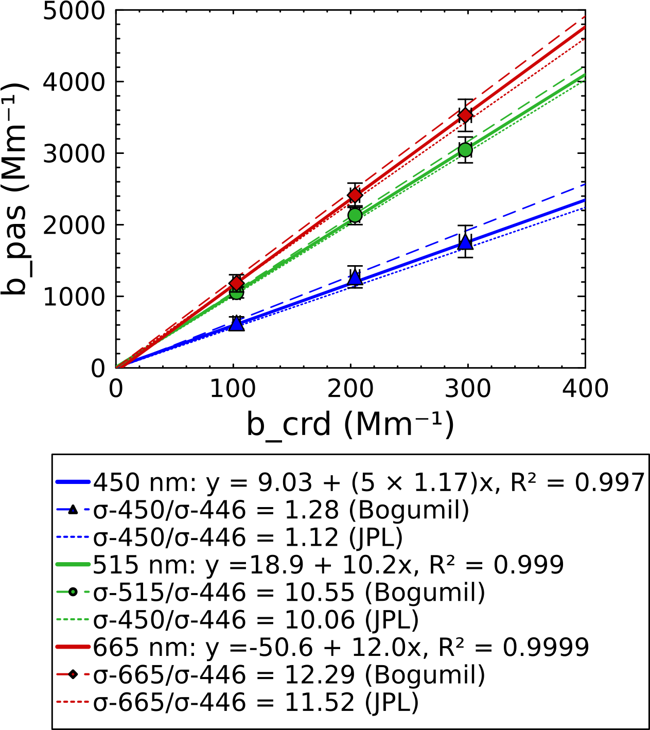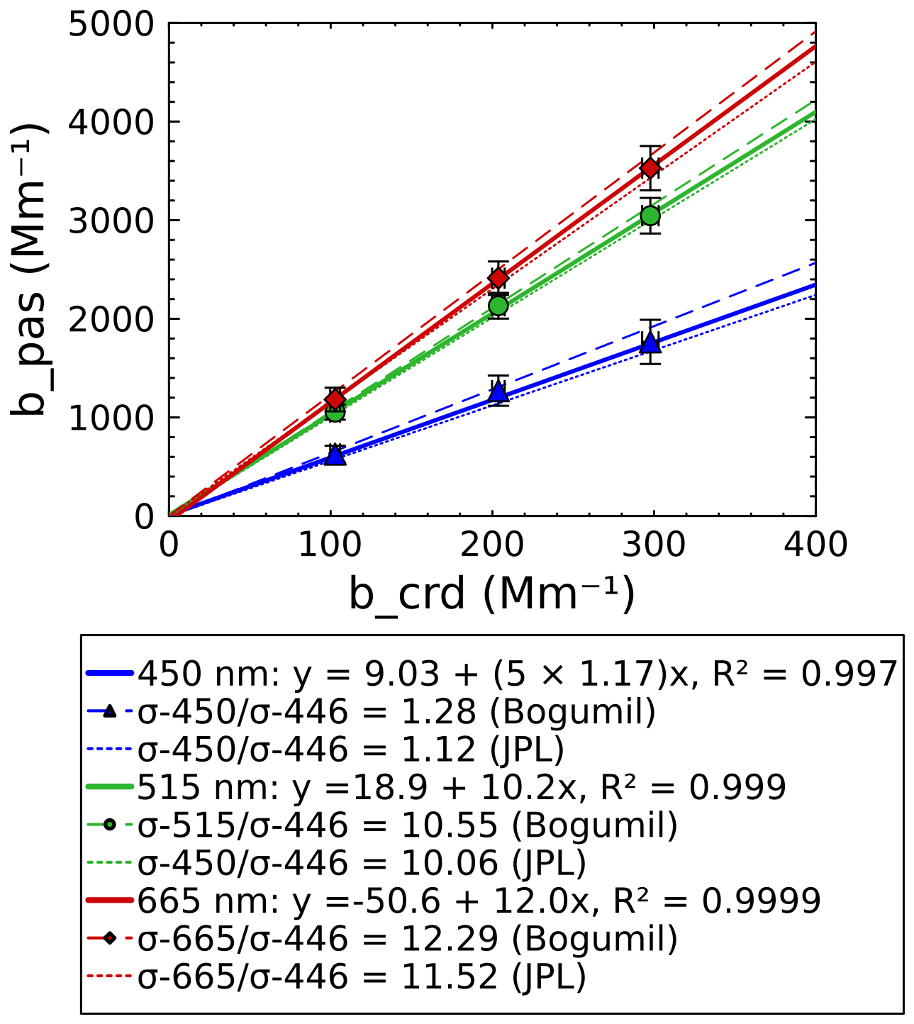 Figure 5Validation with ozone showing the ozone absorption coefficient measured by PAS at each wavelength (abscissa) vs. the ozone absorption cross-section measured at 446 nm using CRDS (ordinate). The slope of each solid line represents the ratio of as measured by PAS and CRDS, while dashed lines represent the expected ratio from literature values. Points represent 2 min average measurements of a single ozone concentration, and error bars represent the propagated uncertainties for the analysis and are discussed in the Supplement. PAS values for the blue channel have been multiplied by 5 for clarity on the plot.