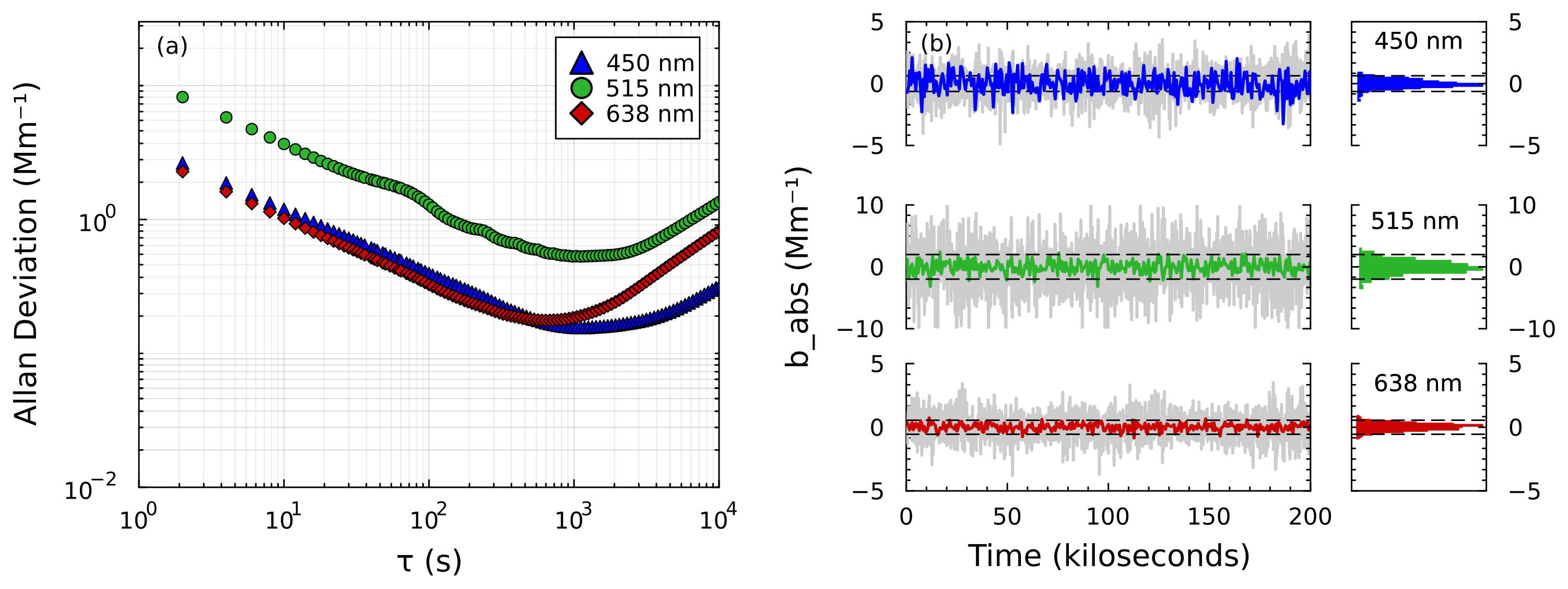 As discussed elsewhere, the Allan deviation provides an estimate of the instrument's ultimate detection limit (Giglio et al., 2016). Figure 6a shows the results of our Allan deviation analysis for the SiMPLE-PAS, which look typical for the Allan deviation. The Allan deviation is similar to the standard deviation but isolates the effects of random noise and long-term drift, while standard deviation does not (Langridge et al., 2008). The x axis in Fig. 6a represents different averaging times, τ, and the y axis shows the Allan deviation for each averaging time. The left portion of each trace shows a negative slope, which represents increased precision due to cancellation of random noise as averaging time is increased. The right portion of each trace exhibits a positive slope, which represents the decrease in precision associated with long-term instrument drift. The x value corresponding to the minimum deviation for each trace represents the optimum averaging time for that wavelength, with longer times representing a more stable instrument, while the y value represents the detection limit expected at that averaging time. Here, we observe good stability at all wavelengths, with the blue and green wavelengths reaching a minimum deviation at averaging times of approximately 1110 and 1180 s, respectively, while the red exhibits lower stability with an optimum averaging time of approximately 680 s; it is unknown why the red wavelength is less stable. The stability of the SiMPLE-PAS is therefore very competitive when compared to other PAS instruments. For example, Fischer and Smith (2018a) show inflection points at near 1000 s for the four channels of their MultiPAS-IV multi-pass, four-wavelength laser PAS; Schnaiter et al. (2023) show turn over points between 2000 and 3000 s for their single-pass, four-wavelength laser PAS; Kapp et al. (2019) show an optimum averaging time of approximately 1000 s for their single-wavelength LED PAS; and Cui et al. (2025) show a relative short optimum averaging time of 48 s for their 3D-printed PAS. Likewise, the ultimate detection limits deduced from Allan deviation for the SiMPLE-PAS are very competitive compared to other PAS instruments. We observe detection limits of 0.15, 0.50, and 0.17 Mm−1 at 450, 515, and 665 nm, respectively. Fischer and Smith (2018a) show Allan-deviation-based detection limits 0.05 to 0.1 Mm−1. Notably, their instrument uses a multi-pass cell to increase sensitivity and thereby achieve lower detection limits, although, here, we show similar numbers for the single-pass SiMPLE-PAS, which we attribute to the smaller cell diameter of the SiMPLE-PAS (per Eq. 2). This is in agreement with the work of Schnaiter et al. (2023), who report an ultimate detection limit of 0.09 Mm−1 for their four-wavelength, single-pass cell. Linke et al. (2016) report detection limits of 3.7–12 Mm−1 for their three-wavelength PAS; Yu et al. (2019) report detection limits in the range of 0.20–0.90 Mm−1 for their differential, multi-wavelength PAS (RGB-DPAS); Kapp et al. (2019) report a detection limit of 3 ppb NO2 or roughly 5 Mm−1 at the central wavelength of the LED (405 nm) assuming normal temperature and pressure (NTP) (Bogumil et al., 2003); and Cui et al. (2025) report an ultimate detection limit of 0.33 ppm CO2 or roughly 0.05 Mm−1 for their multi-pass, 3D-printed PAS.