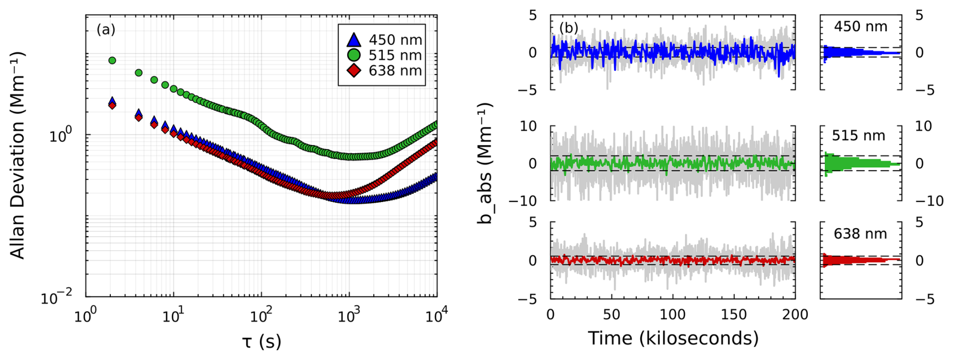 Figure 6Detection limits of the SiMPLE-PAS. (a) Allan deviation results and (b) method detection limits determined from standard deviation. For panel (b), gray lines correspond to 2 min averages, and colored lines (and histograms) correspond to 10 min averages. Dashed horizontal lines correspond to the 2σ limit of detection based on the 10 min averages. Uncorrected data from panel (b) are shown in Fig. S7.