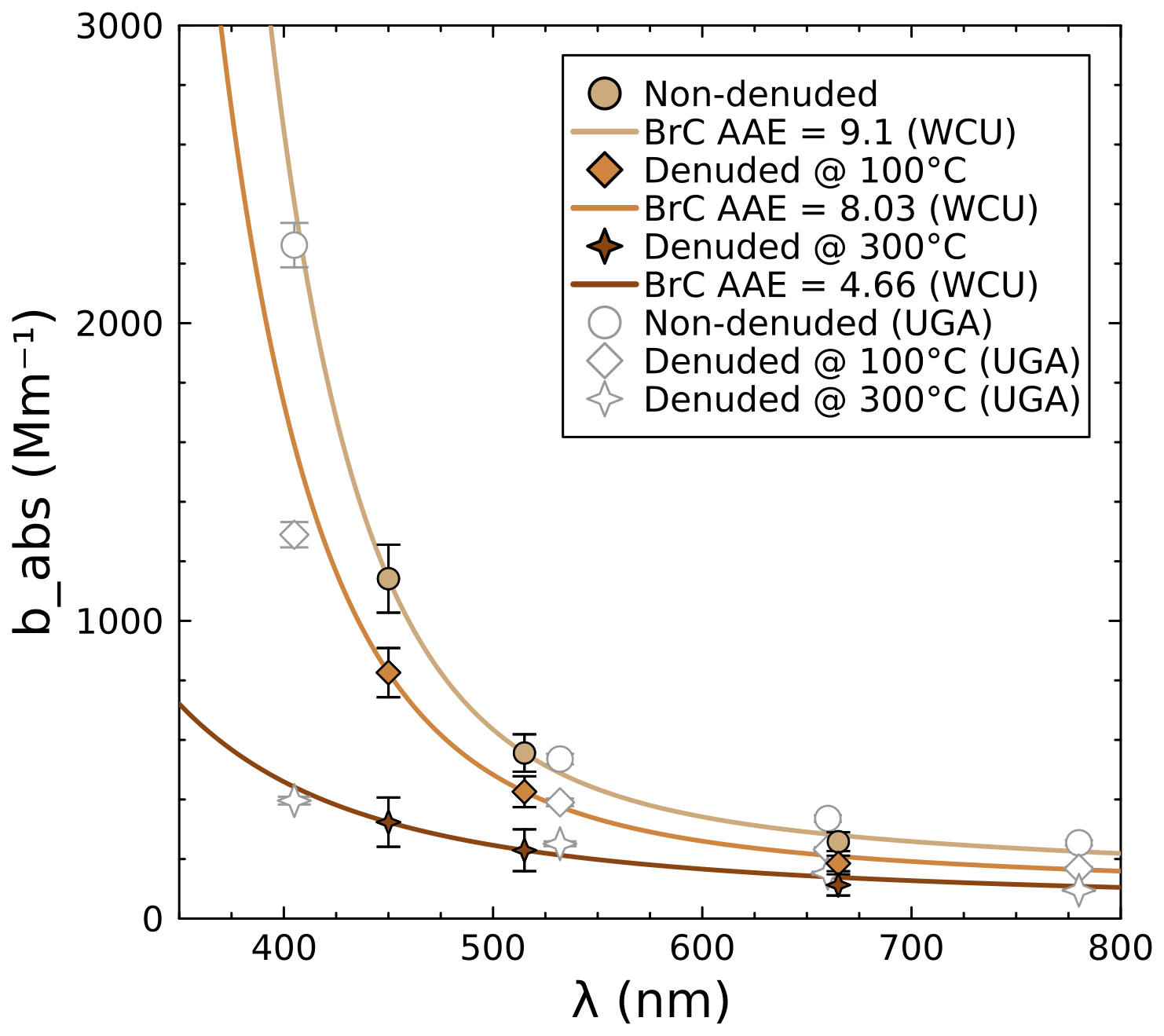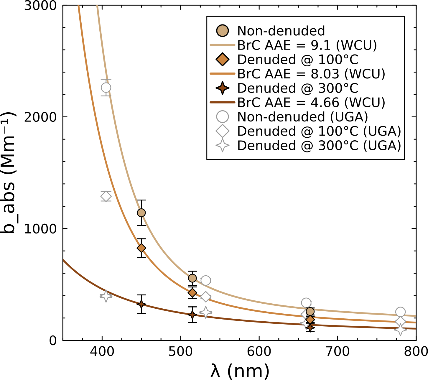 Figure 7Comparison of absorption spectra for denuded and non-denuded biomass aerosols measured by two PAS instruments. Colored points represent the SiMPLE-PAS measurements, while empty markers represent the MultiPAS-IV measurements. Lines are the calculated aerosol absorption spectrum (Eqs. 3–5) based on only the SiMPLE-PAS data; MultiPAS-IV data were not used to determine the lines.