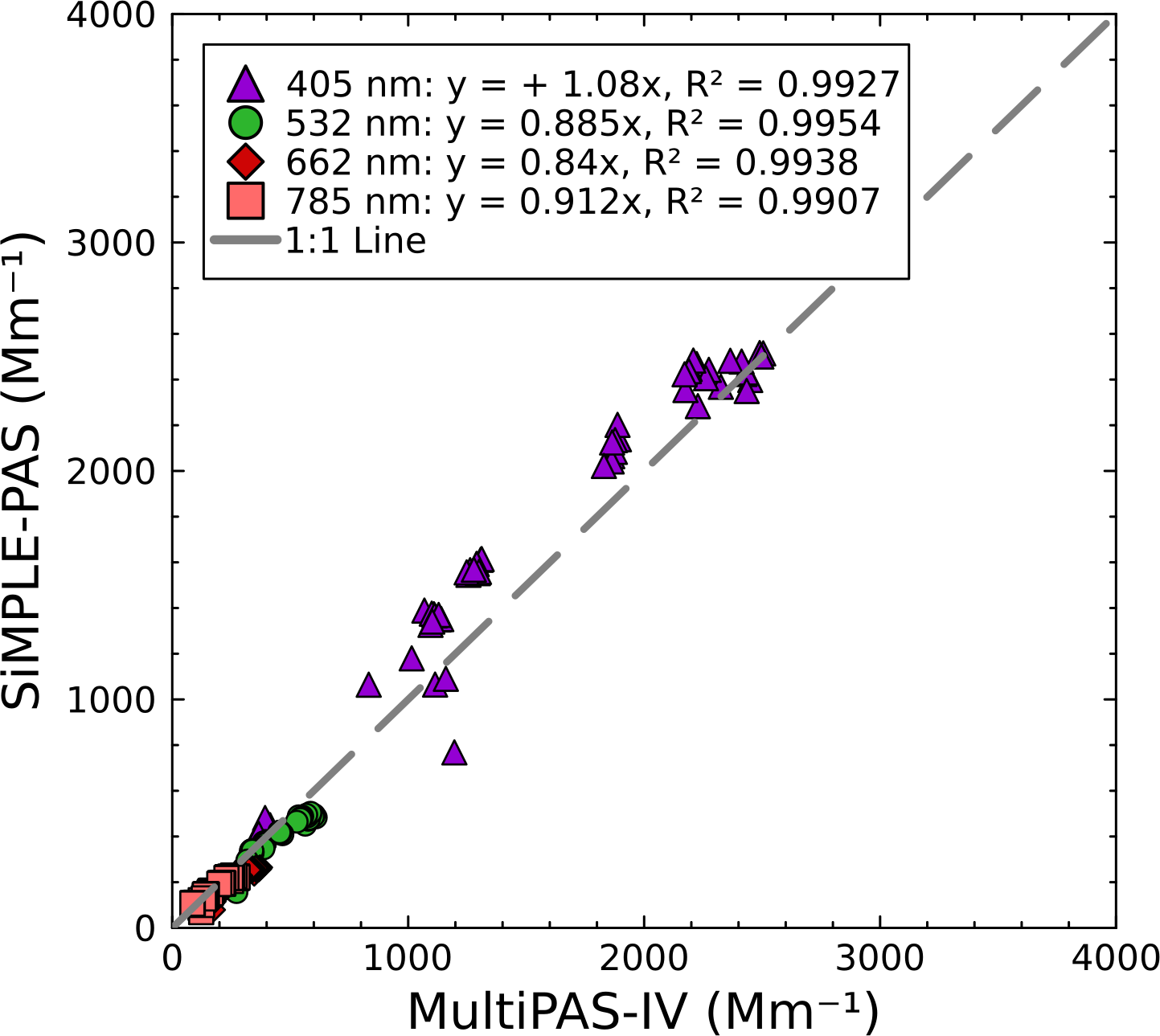 To further compare the SiMPLE-PAS and MultiPAS-IV measurements, we bin the data for the full experiment into 60 s averages for both instruments and use the SiMPLE-PAS AAEs to calculate the absorption at 406, 532, 662, and 782 nm (the MultiPAS-IV measurement wavelengths). In Fig. 8, we show these values plotted against the MultiPAS-IV values measured at each wavelength. We see that most points tend to cluster around the 1 : 1 line, with R2 values in the range of 0.990–0.995 (depending on wavelength, as shown by series colors in the plot), indicating that the SiMPLE-PAS agrees with the MultiPAS-IV. We observe deviations from a 1 : 1 relationship ranging from −15 % to −9 % for the IR, red, and green wavelengths and a deviation of +8 % for 406 nm. For the first three, we suggest that this error is consistent with the determinate error in the calibration with ozone, which could have been greatly reduced by calibrating against the CRDS had it been available. For the case of 406 nm, we see a positive error. We attribute this to errors in extrapolating the SiMPLE-PAS AAE from 450 to 406 nm under high-AAE conditions where the wavelength dependence is very steep and therefore harder to predict via extrapolation. This analysis highlights the uncertainty involved in extrapolation and, therefore, the need for wide spectra coverage in PAS measurements, although it has been common in the PAS literature to extrapolate from two wavelengths or even one wavelength. Despite these errors, we again note that, overall, the points tend to cluster around the 1 : 1 line and therefore believe that these data demonstrate good agreement for absorption measurements of biomass aerosols.