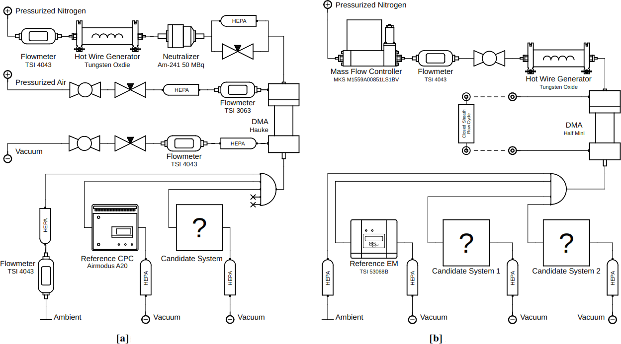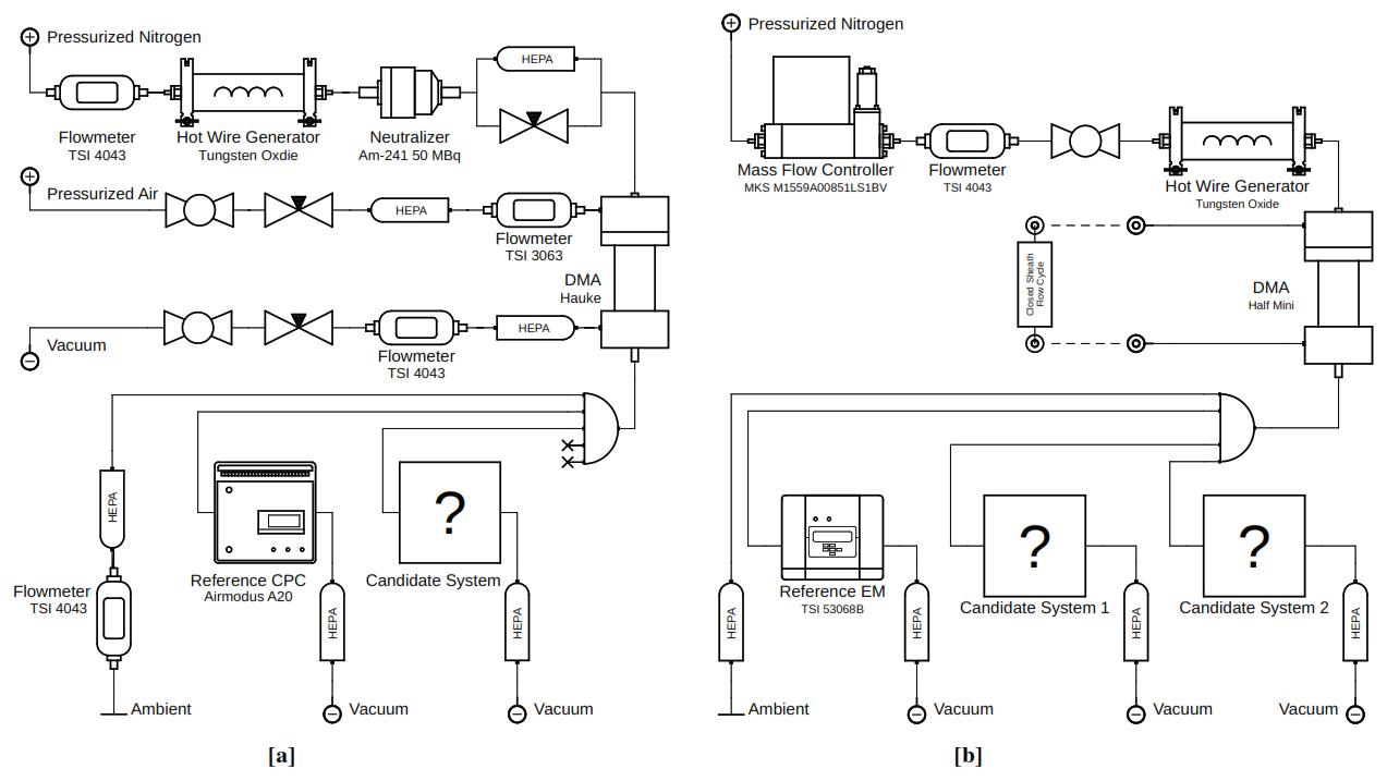 Figure 1Schematic of the setups used for the workshop measurements. (a) Hauke setup and (b) Half-Mini setup, which were used for the linearity response, chamber response, sizing accuracy and detection efficiency measurements.