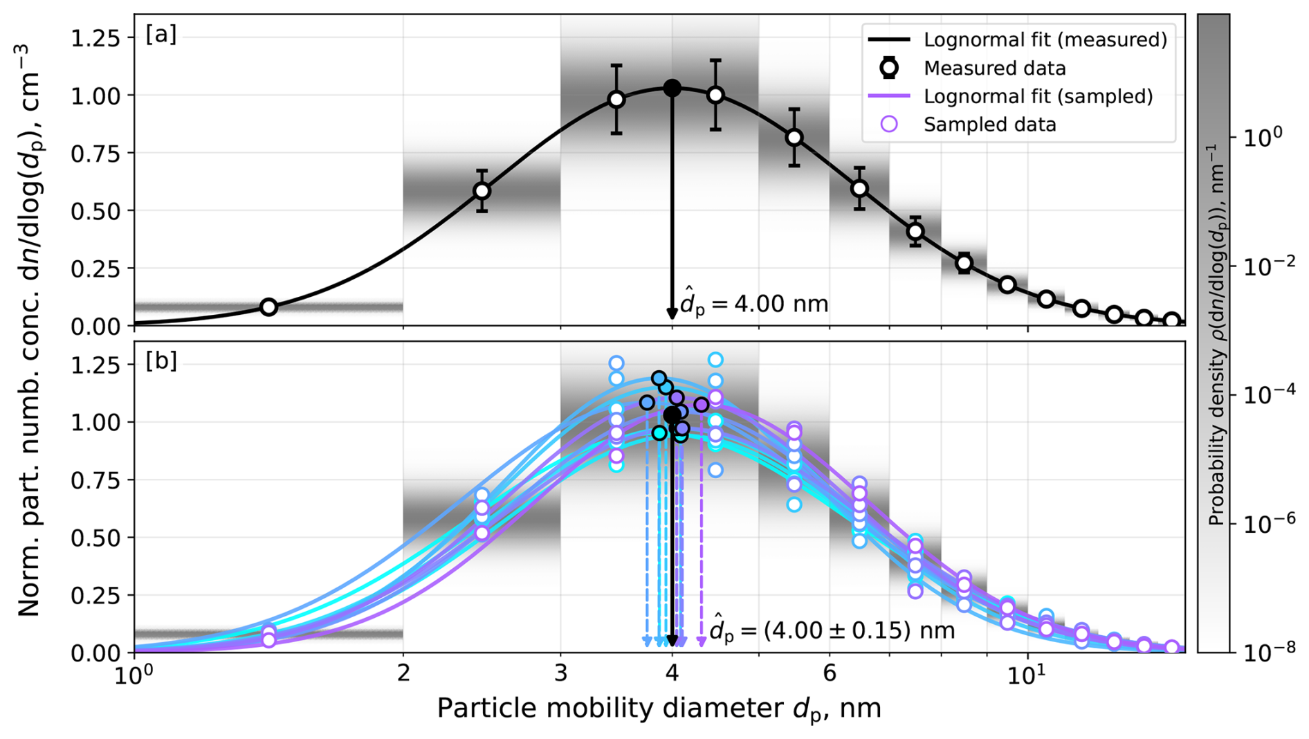 Generating a stable aerosol signal that conserves particle concentrations and the population's geometric mean diameter (GMD) poses a critical factor to most aerosol measurements and their reproducibility. While variations of the GMD effectively turned out to be negligible during the workshop's investigations, keeping the particle concentrations at a reasonably stable level throughout a measurement period manifested as more challenging. On this behalf, the results obtained from concentration measurements are represented as the (channel-wise) median ni,50 rather than the arithmetic mean as mentioned previously. By taking this action, we aimed to actively avoid concentration outliers significantly biasing a proper representation of the underlying particle distributions. Accordingly, the interquartile range (IQR) was used for mapping concentration uncertainties. The error bars of quantities derived directly from measured data were calculated in accordance with Gauss' law of error propagation. For this matter, the IQR values were transformed to an estimate of the standard deviations using σ ≈ IQR1.34 prior to error propagation. For computing uncertainties of quantities resulting from regression models (e.g. the slope of a linear fit or the peak location (mode) of a Gaussian fit), a Monte Carlo uncertainty estimation approach was used. This method is depicted in Fig. 2 and described in the following steps: