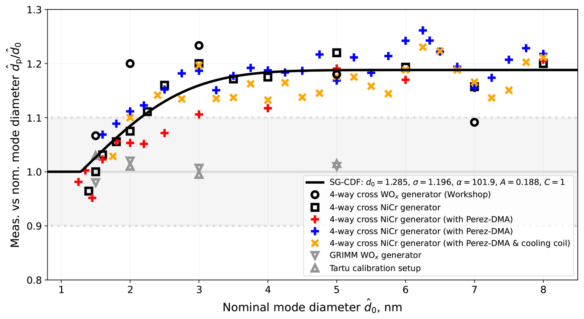 Figure 3Particle size shift of the 4-way-cross glowing wire generator during workshop measurements. The ordinate shows the ratio of mode diameter measured with an Airel NAIS in negative ion mode to the nominal diameter (according to THAB calibration) . The solid line is a skewed Gaussian cumulative distribution function fit (SG-CDF, Eq. 3) with parameters d0, σ, A, α and C. Marker types indicate measurement conditions: circles for the workshop setup, squares for NiCr particle seed, red and blue plus symbols for two independent runs performed with NiCr and a Perez-DMA, yellow cross symbols for a measurement conducted under otherwise identical conditions (but with cooling of the aerosol flow added prior to the DMA's inlet) and grey triangles for a different source excluded from the fit. Error bars are omitted for clarity. See Sect. 3.1 for discussion.