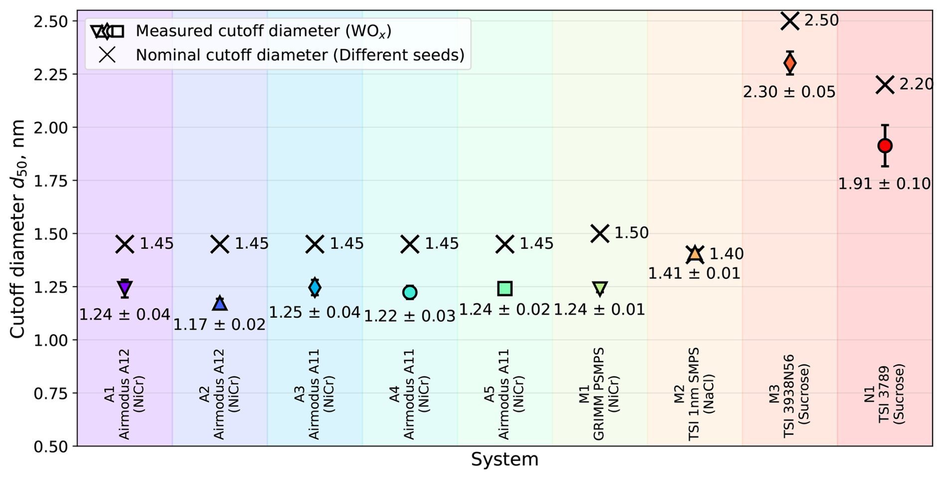 Figure 4Results of the detection efficiency measurements. Crosses indicate the nominal cutoff diameters d50,nom specified by the manufacturers using the seed particles listed below each system name, while differently shaped coloured symbols show the cutoff diameters measured with WOx on the workshop setup (see Sect. 3.3 for discussion).