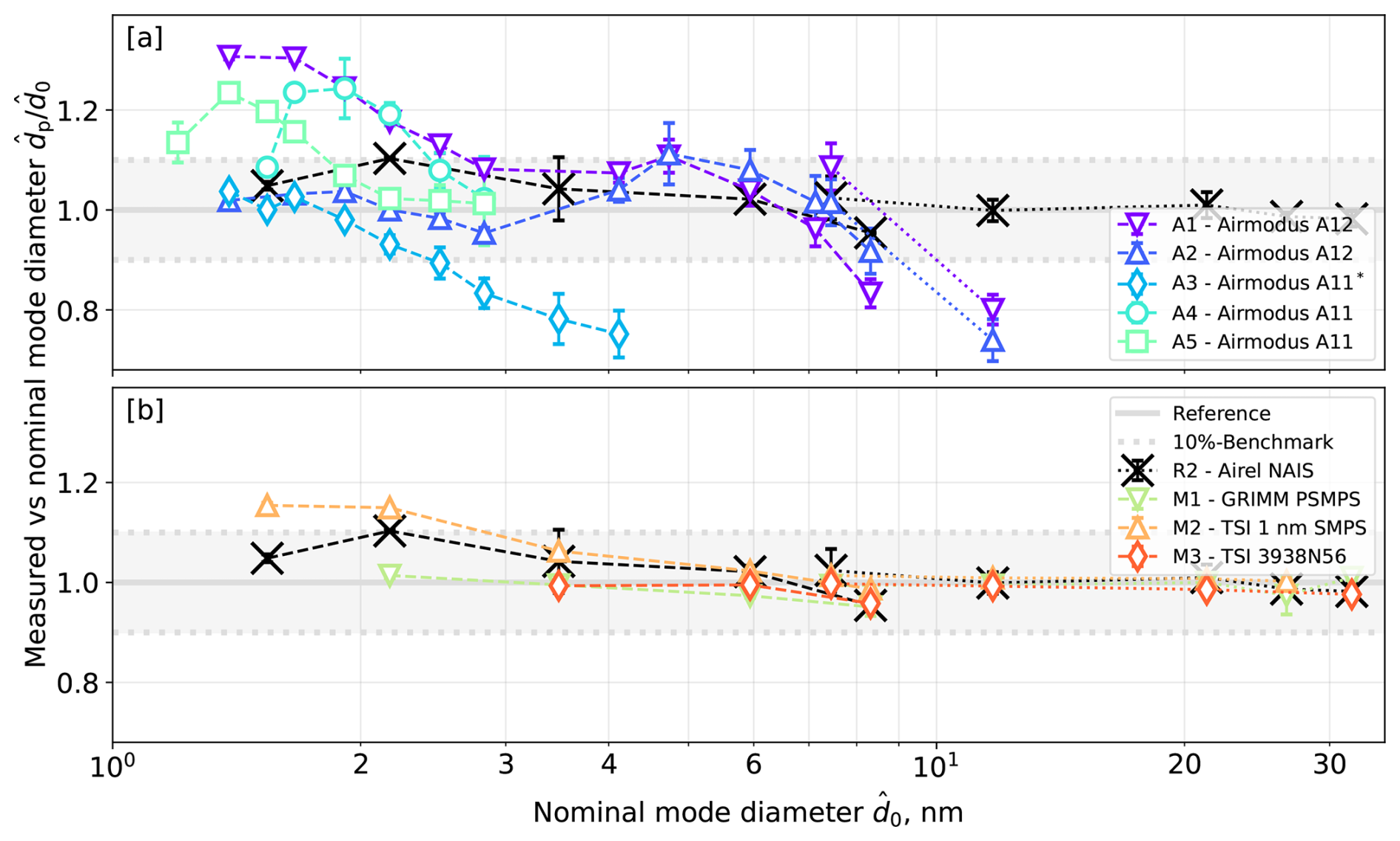 Until recently, detecting and characterizing sub-10 nm particles has been technically challenging, and measurements were typically limited to laboratory-based studies and specialized instruments (Chen et al., 1998; Kangasluoma et al., 2020). Due to their small size, these particles exhibit high diffusivity and low charging probabilities, complicating reliable measurement. However, owing to innovative methods emerging over the past decade, reliable techniques for sizing aerosol particles down to 1 nm have been developed.
