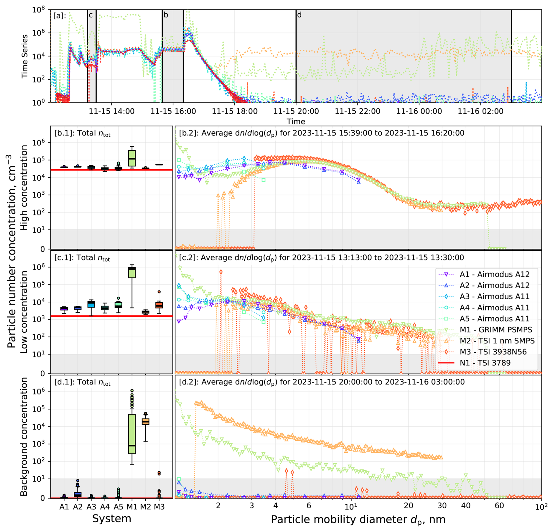 Figure 6Chamber measurement results. Panel (a) shows the time series of total particle number concentrations ntot for all systems, with grey areas indicating the periods detailed in panels (b)–(d) (high, low and background concentrations). Box plots in panels (b.1)–(d.1) show ntot from different instruments, with the red line indicating ntot,N1 measured by the TSI 3789 CPC and normalized on 0.846 (Sect. 3.2). Panels (b.2)–(d.2) show particle size distributions versus dp plotted on a logarithmic scale, with grey areas marking the linear regions of the ordinate (see Sect. 3.5 for discussion).