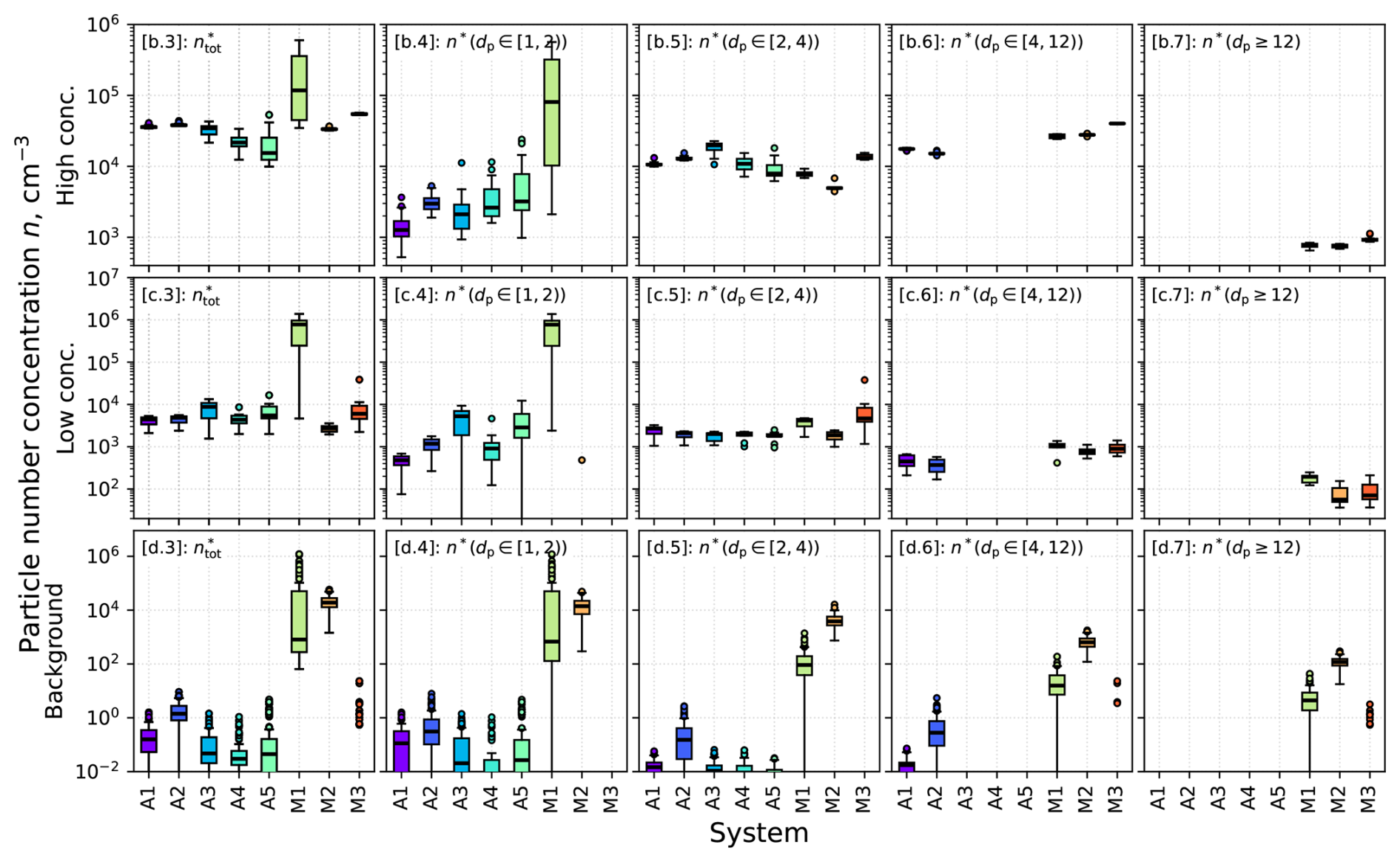 Additionally, Fig. 7 provides a more detailed breakdown of the different concentration regimes investigated – high, low and background particle concentrations. In this figure, the column labelled [3] shows box plots of total particle concentrations resulting from an integration of the particle number size distributions within the time frames indicated by Fig. 6a. That is, while the activation-based systems are perfectly capable of reporting total number concentrations above their upper sizing limits (∼ 4 nm for the Airmodus A11 and ∼ 12 nm for the Airmodus A12), these number are not accounted for in but are reflected in ntot, as found in Fig. 6b.1–d.1.