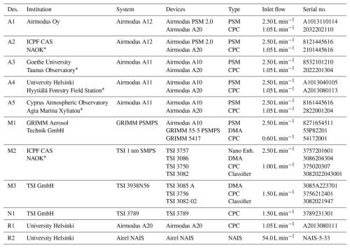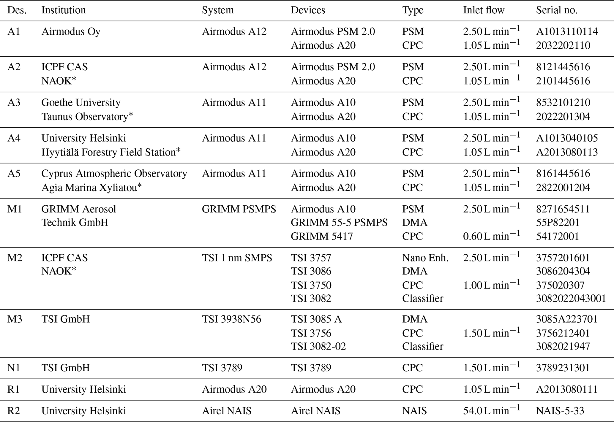 Table 1Overview of systems investigated during the workshop. Letters in the designation indicate the classification method: “A” denotes activation based, “M” mobility based, “N” non-classifying and “R” reference only. Sites marked with “*” are ACTRIS National Facilities. The column “Inlet flow” lists the (nominal) sampling flow rates of the instruments.