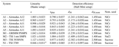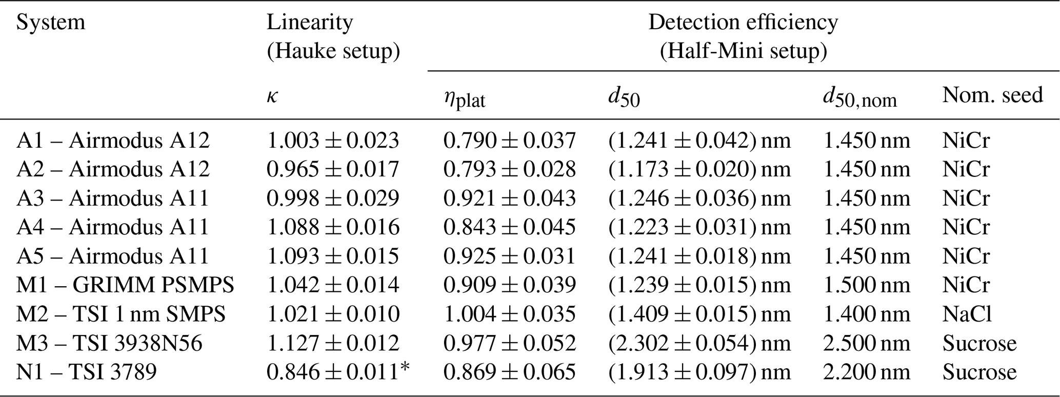 Table 2Linearity and detection efficiency measurements for the systems investigated. The column κ shows the linearity factor obtained on the Hauke setup (Sect. 3.2). Detection efficiency measured on the Half-Mini setup is reported as the plateau height ηplat and the size-shift-corrected cutoff d50, with the nominal cutoff d50,nom as declared by the manufacturer and the corresponding particle seeds in the last column (Sect. 3.3). Entries marked with an asterisk indicate defective units.